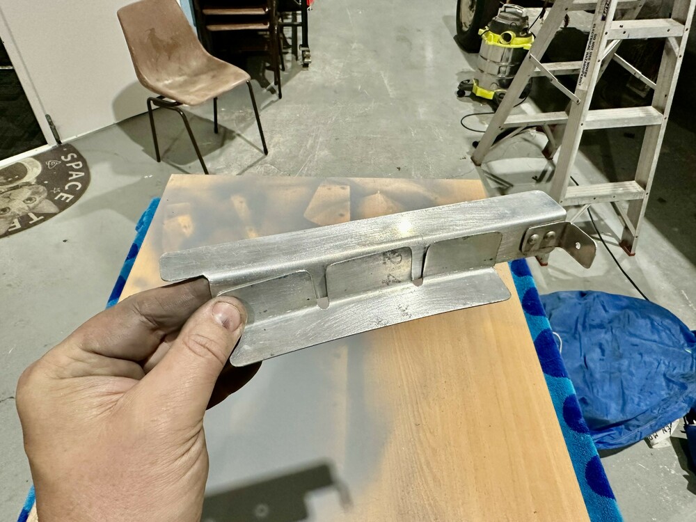 Circuit breaker panel all cleaned down and given a first-pass panel beating! This original breaker panel has seen better days and was badly bent/dog-eared, along with having a host of dents across its face. Some light planishing and it already looks much better. Unfortunately, the panel mounting holes have all been badly elongated due to excessive wear and tear. Not much can be done here outside of creating a fresh doubler reinforcement and affixing. Interestingly, the electrical harness exit on the lower left hand side of the panel houses a domed flute, which has been welded to the panel face, which was surprising. All 24 of the circuit breakers will be replaced with simulated breakers, which will be operational to the simulator. This means the breaker labels will be re-done with those in the sim, rather than 100% replicating those from the original cockpit.