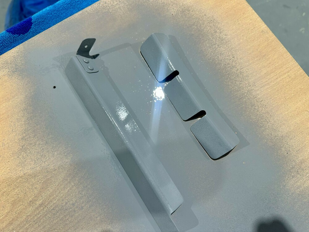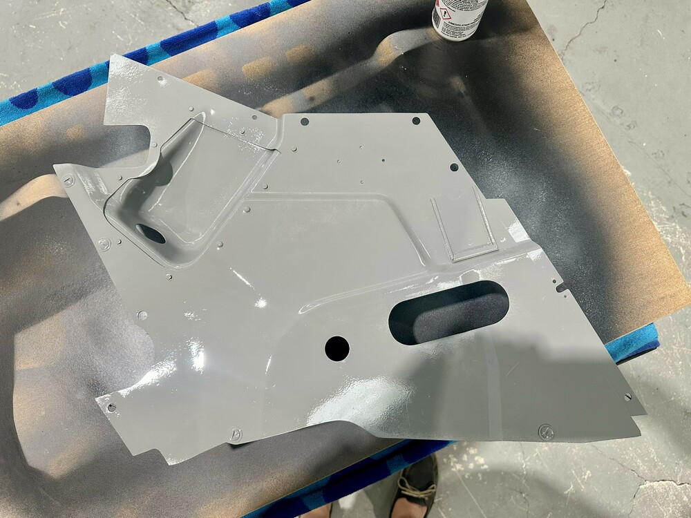 Right hand side kick-panel was media blasted today and given primer paint. The panel is now awaiting the arrival of the finish colour paint, which is a British Standard Colour BS2660-7087 Steel Blue, which is extremely close to the original colour used by the RAAF.