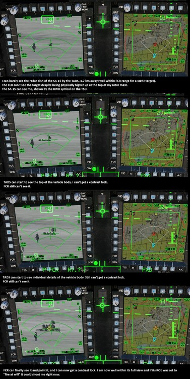 This is related to this discussion: That forum link happens to show a video taken by an ED beta tester detailing exactly what I just tested in the ME with an SA-15 on the Nevada map. There was an original claim by players that the FCR radar beams weren't originating from the FCR dome on top of the rotor mast, but instead coming from the nose of the aircraft where the TADS is. Raptor from ED claimed this was false. So I think Raptor is actually correct, but there is a caveat that he didn't mention which explains the behavior shown in the video from the link and the screenshot above. The video and screenshot collage clearly shows that if TADS can't see a target, the FCR can't see it. Specifically, if TADS can't get a contrast lock, then the FCR has nothing to paint as a target. My theory is that this is because of the LINK feature. LINK allows the TADS to snap to a target painted with the FCR. While the radar beams are most likely coming from the FCR dome, I believe there is game logic in the programming code that tells the FCR to not paint a target if the TADS can't achieve a contrast lock. One possible reason would be to avoid a multitude of CTDs and program freezes while the game tries to find the related target to snap the TADS to but can't. Whatever the reason, the fact is if TADS can't see it, your FCR can't either, which completely negates the advantage of putting an FCR at the very top of the aircraft and peeking it over a hill to avoid exposing your entire helicopter. Raptor originally gave this explanation for why this appears to be the case, and he said some calculations were corrected for a future patch, but as of patch 2.9.9.2474 the FCR still can't be used as it was originally designed: So my question is...when will this finally be fixed ED? I shouldn't have to expose my entire Apache aircraft body to get a lock with the FCR.