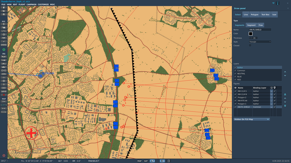 Reproduce: 1. Create a line graphic in the DCS Drawing editor, name it something the KW will pick up. Example: "KW-PL SHIELD" 2. Run the mission and look at your battlefield graphics 3. Note that the Line shows up with number waypoints, like it is a route: "7W, 6W, 5W" etc. Expected Behavior: The line should not have waypoint markers. Actual Behavior: The line has waypoint markers. Notes: not sure if this is a bug or how the actual aircraft works. It doesn't match the manual, so just wanted to confirm either way. Track and miz attached. Thanks! nullnull Thunderhorse_Day0_v1.miz KW_graphics.trk