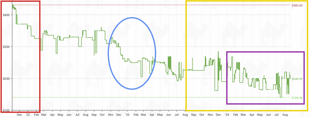LMAO Whatever. I didn't "lose" on anything. The chart I posted shows that very clearly. Simple: You stated CPU prices don't drop over time. I showed factual data that proves you're wrong. (Then of course, the usual ton of drivel trying to qualify you didn't say what the quotes prove you did say). If anyone "lost", well...lol it ain't me. And again, leave the personal insults out of it. Find one person I've done business with that isn't happy with what they got. Oh, wait...you can't Seriously, leave the personal attacks about me and my business out of it. Let's debate the issue on the merit of the facts. And the facts in this case (see the chart) show you're wrong. Incidentally, below is the same chart with some annotations; let's assume for a moment you're right (just for the sake of discussion). The red box indicates the area of what you call 'lunatic fringe' drop off. The orange box roughly illustrates - as a guess - where it seems you feel the CPU is 'obsolete' (since last year; around 18 months after release). Even if we exclude those two regions entirely, the price can still be seen decreasing in the time between the two. In fact, the blue oval shows where the biggest drop in price was - and it's not during either of the periods you exclude: It dropped by ~$100 a year after release (i.e. no 'lunatic fringe') and roughly a full year before the 14500 was ever released. Way before anyone would call it obsolete (although maybe you can find an authoritative reference showing a 12700k was obsolete in winter 22/23). In fact, during the time since the 14500 was released, it's more or less hit and stayed at $240, while the 12700k has dropped even further, to less than $200 at times (purple box). So, $190 for a CPU that performs better (and doesn't possibly destroy itself)...or 26% more for one that performs less (and who knows lol)? Now I'll quote myself: And, well...it does.