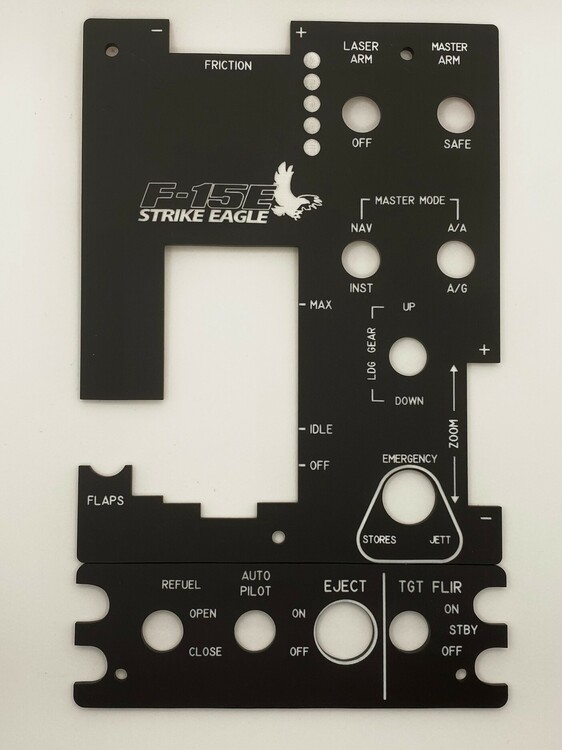 @Immune I have a laser cutter/engraver and make custom plates for my TM Warthog Throttle and anyone who asks for them. I just did a job for another DCS member who in addition to the TM throttle plate asked for a custom WinWing plate. He sent me a 2D CAD drawing (in dxf format) that had the exact dimensions and I was able to create the labels he wanted. If you have the ability or the willingness to create a drawing with the dimensions and hole placement, I can design a face plate with labels that can be backlit by the LEDs on the device. Unfortunately, I don't own any WinWing products to do the initial design myself. I'd be happy to collaborate with you to get your something you can use.