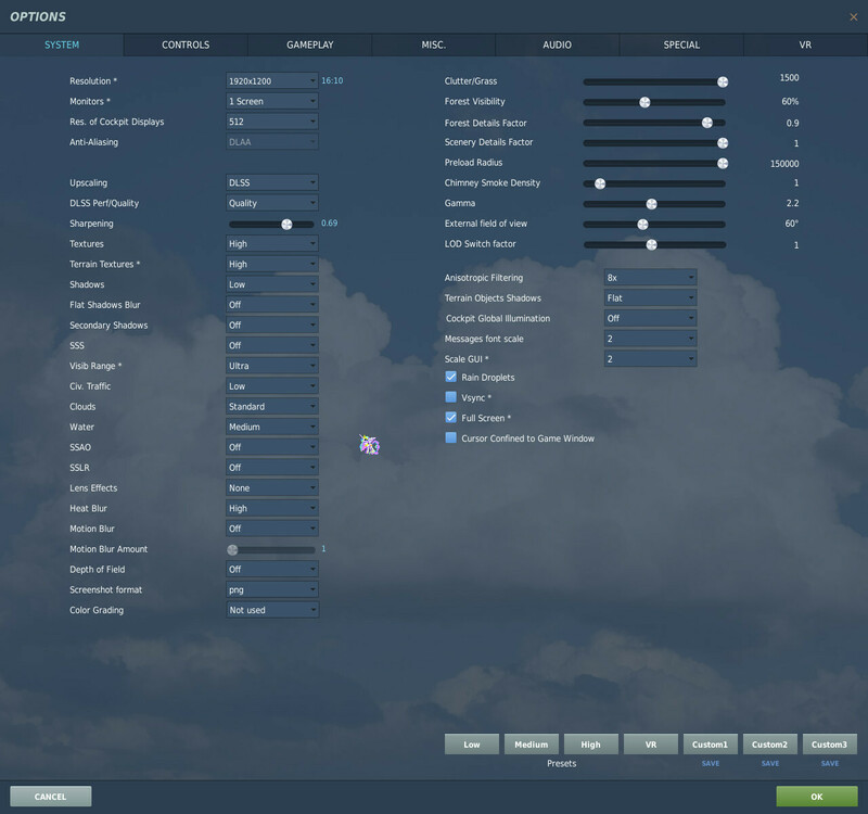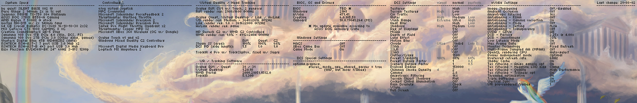 I've been having performance issues in VR for quire a while now, with two major impact points... - the first of which being somewhere in late 2020 crippling my DCS performance heavily when using a Metabookulus Quest of any kind (don't have a Pro, though) - which I couldn't solve yet - the second being a major performance impact in VR only with the 2.8 update last November, apparently only really affecting that WMR garbage with the Reverb G2 which was very promising when I still had the 1080 in the rig, but basically didn't gain any performance at all by upgrading to the 3070, plus adding a ton of WMR crashes since (still got the old cable, waaay out of warranty, and I honestly don't wanna fix that anymore while having a Q3 with way better lenses) already before taking the hit, which it only partially recovered from with the step to the MT - and now the addition of DLSS. I started typing this in the patch notes thread with this, but thought it'd be better off as a single post over here: Imagine being just barely able to run the thing at 30ish fps in the G2 at 2456x2404 per eye on a 3070 that was over a grand and then reading this... (and yes, I know the 4090 is a completely different piece of kit) Weirdly enough, I'm pretty much locked at 90fps in the CV1 at 2160x2400 per eye. Quest performance is almost similarly as bad as the G2's, I just recently was happily able to post a 90fps screenshot based on the Snapdragon Game Super Resolution thing and Synchronous Space Warp in Virtual Desktop. Only to find out later that VD displays twice the frame rate that DCS does with SSW enabled. I'm literally pegged to 180fps in pancake at 1290x1200 with the same settings, but even DLSS doesn't really seem to help in VR. My specs are in my profile, I need to update the driver versions and settings though, so here are my current ones: Running MT client with --force_enable_VR --force_OpenXR. As opposed to my settings in the profile banner, I've disabled the single pass stereo line a while ago and kept it off as it apparently doesn't make any difference anymore (it absolutely did a few years back). HAGS is off. Can't enable REBAR (requirement checker is all green-lit, but it doesn't work and basically kills all my system's S3 state capabilities), so I left that off in BIOS. I'm still on the 537.13 driver, though, but I guess I won't see any major impact through updating since I'm having the issues with the Quests which are my main target to fix for years now and no driver update ever changed that. Something kills my performance for WMR and the Quests in both (Air/Cable) Link and Virtual Desktop. Only VR that runs nice and smooth is the CV1. I'm carrying around this issue for 3 years now, went through 2 new Quest lines, a completely new rig, a GPU swap in that one and an OS reinstall as well as trying all the shenanigans and settings that others suggest both here and in various YT videos. I literally had better frames in the Reverb G2 at the default 3168x3100 with the same rig, but still the 1080 instead of the 3070 in there... I've basically tried anything except for taking the step to Win 11 and using the OpenXR toolkit. I just want to be able to really enjoy my DCS in VR again... thanks for any help in advance!
