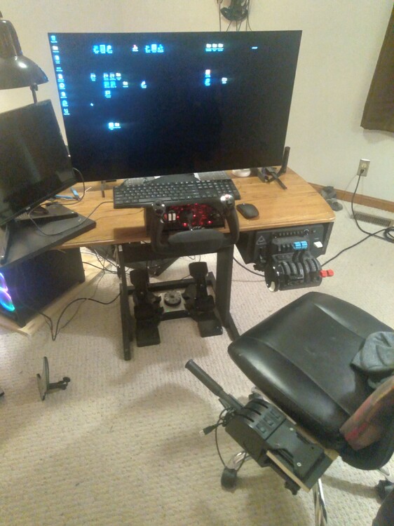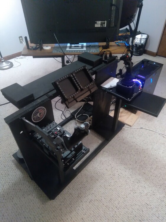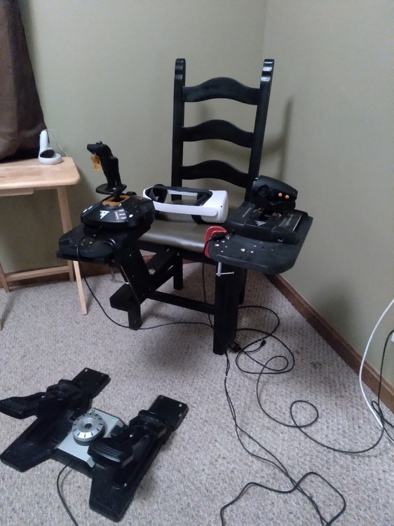 Yeah, I;m really of the same mind. I've built panels for other sims, but I always begin to realize I'm doing more building and tinkering than flying. Also, I simply get tired of all the wires and stuff entwining the computer desk. A 2D setup is fine for practicing, but with my 4090 card and Reverb G2, VR is the way to go. I have the Winwing Viper HOTAS, and that seems to be enough in VR. And I have the old Thrustmaster MFDs attached to a small second monitor that work well in 2D. I'm having a really hard time resisting ordering the Winwing ICP because it looks so cool. Besides, reaching for the mouse and manipulating those great in-game cockpit panels can't be any more time-consuming than reaching for all the switches mounted to the desk. And I never lose situational awareness in VR. I firmly believe less is more and prefer not being stuck to one plane, or sim. I have the Tobii, but for some reason headtracking in 2D just never did it for me. Those elaborate cockpits some have built do look cool, but then they have small monitors that would kill it for me. To each his own, I suppose. This is my setup I built strictly for the Viper. The desk behind it is where I attach the Honeycomb stuff for other sims and a second monitor for Navigraph. All are removable so the desk can be cleared for 3D designing, printing and other stuff. When I fly the Viper, I simply place the monitor and rudder pedals on the Viper. Very modular and with minimal mess. Here's the flip side. I've even attached an old Logitech throttle quadrant to the side of my chair for helicopters. I just remove the Honeycomb Alpha and clamp my old joystick for copters or Spitfires. All very quick-change.