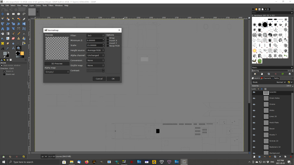 I’ve had pretty good results with the nVidia plugin: I make “normal map templates” with different layers for each - panel lines, rivets, fasteners, holes, screws, etc., with opacities set to personal taste but no more than 20 percent, depending on how heavy you want the effect to look. The background colour is a neutral grey. 3D effects such as raised edges or panels, are in white, at about 10% opacity. When you are ready, flatten the image and then use the plugin. Save as a DXT5 dds file, no mip maps. I use these settings for the plugin: -