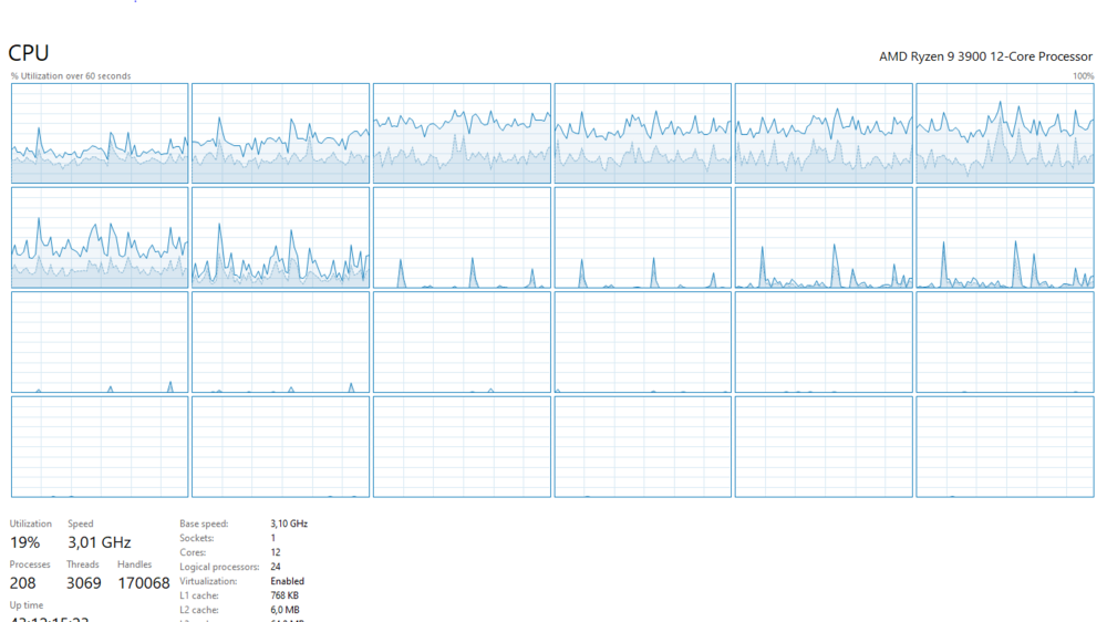 I see the same problem on our AMD server (latest patches as of yesterday). If I remove the overloaded cores from our highest demanding server instances and add them back, it looks a lot better - affinity setting needs looking into please - in how far this is related to a performance issue with the new Germany CW map running on our 2 most demanding server instances I cannot say. Before 8am below - instances running with "unpatched" GermanyCW map. After 8am new version with re-saved mission. Peaks removed after 9:45 by re-setting affinits on 2 cores which ran with 90-100% load. Me joinign at 11am. @BIGNEWY null