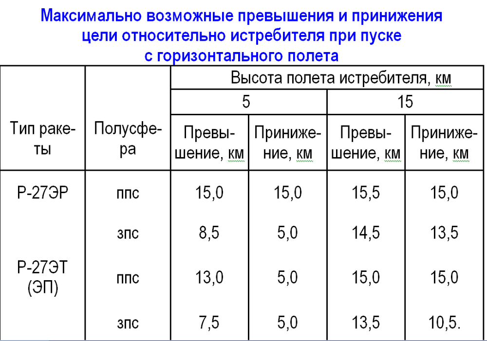 В одном старом источнике нашел в разделе описания применения Р-27ЭР такие слова: Максимально возможные превышения и принижения цели приведены в табл. ракете предусмотрена работа с уменьшенной вдвое частотой повторения импульсов подсвета цели РЛПК, что позволит осуществить одновременное наведение двух ракет на две цели. и таблица