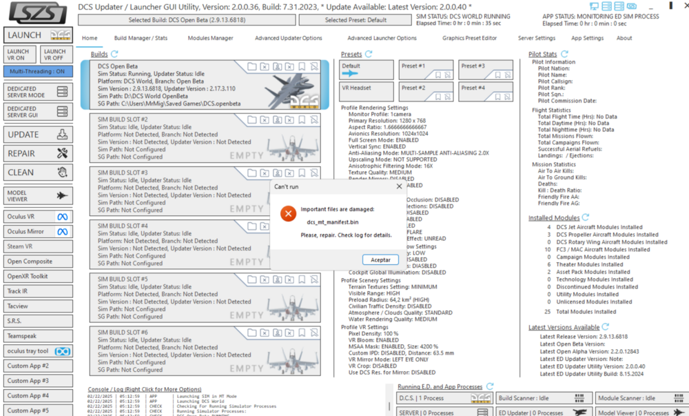 Hello When trying to start the simulator after the last update, it does not go beyond the initial screen, that is, the Nvidia box appears, then the screen of the 15 years of DCS appears in the same box and a little later both the box and the DCS icon of the taskbar disappear and that's it, I don't get any kind of message or error. I have deleted all the unofficial aircraft modules I had and in aircraft I have only left the civilian aircraft and military aircraft mods. I have also tried to repair and clean the DCS, but the result has been in vain. I also have the latest graphics card update. I have also tried to start the simulator through the Launcher GUI Utility 2.0.0.36 application and here I get an error, which says that I have corrupt or wrong the following file: DCS_MT_MANIFEST. Bin I leave a screenshot of this error and a copy of the dcs log file, in case someone could give me a hand. Thank you in advance for your attention and help. Hola, Al intentar arrancar el simulador después de la última actualización, no pasa de la pantalla inicial, es decir, sale el recuadro de Nvidia, después sale en el mismo recuadro la pantalla de los 15 años de DCS y un poquito más tarde tanto recuadro como icono de DCS de la barra de tareas desaparece y se acabó, no me sale ningún tipo de mensaje o error. He borrado todos los módulos no oficiales de aviones que tenia y en aircraft solo he dejado los mods de civil aircraft y militar aircraft. He intentado también, reparar y limpiar el DCS, pero el resultado ha sido en vano. También tengo la última actualización de la tarjeta gráfica. He intentado también arrancar el simulador a través de la aplicación Launcher GUI Utility 2.0.0.36 y aquí si me sale un error, que viene a decir que tengo corrupto o mal el siguiente archivo: DCS_MT_MANIFEST.Bin Dejo captura de pantalla de dicho error y copia del archivo dcs log, por si alguien podría echarme una mano. Gracias de antemano por vuestra atención y ayuda. dcs.log