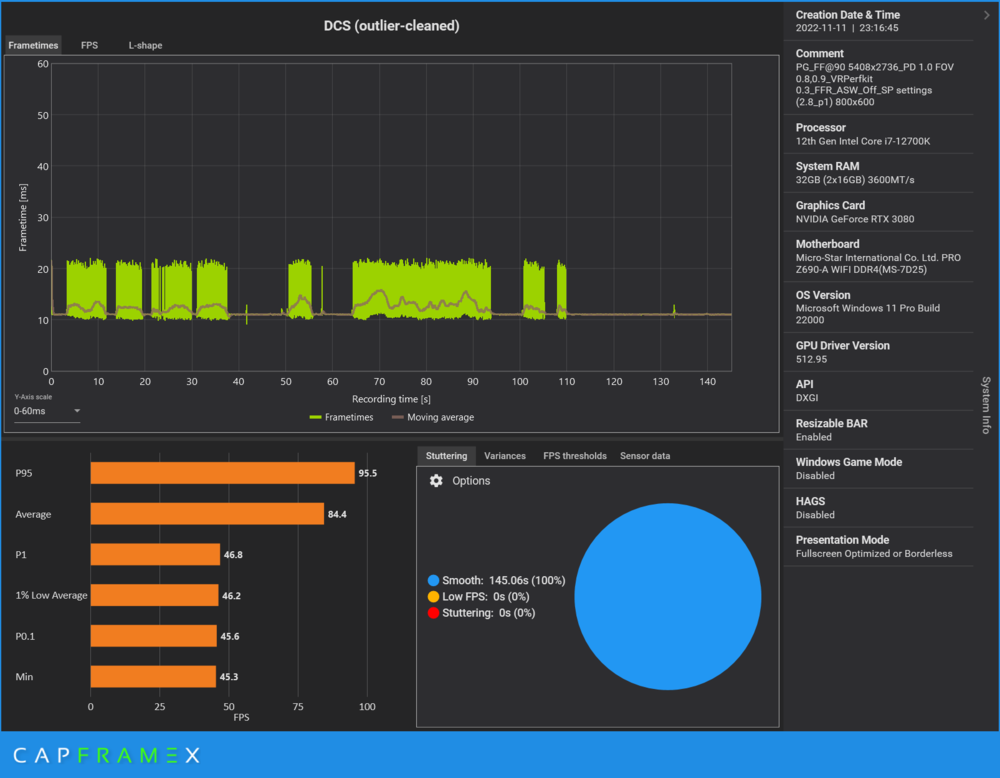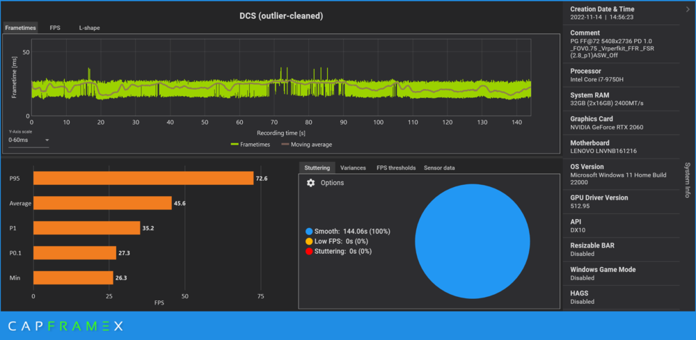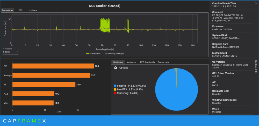 I can confirm that using lower Resolution (either in OTT or in DCS game settings) does affect FPS. One important setting in ODT/OTT is the FOV reduction. For me it worked without visible degradation down to 0.75 (I see the OP has it already down to 0.8) The most important thing with OTT is what OP mentioned about the sequence of actions to launch DCS. Also there is no need to unplug the link cable after each change. You can only force a link cable test from Oculus app which will soft disconnect link. Then you can apply OTT settings and launch link. @Fuggzy Having seeing your results I believe you will be better off with 90hz in Oculus rather than 120. If your system was able to handle 120 you would have 120 in game settings and 60 when ASW was active. ( and despite our efforts to put it off I believe Oculus forces ASW when FPS drop below the setting we put in) The only benefit with ASW on in difficult maps/ scenarios is that you don’t have issues with ghosting as long as your system can keep the half of the used hz (36 for 72hz, 40 for 80hz, 45 for 90hz) There is a nice tool called CapframeX that gives a lot of nice statistics on FPS, power, thermals of your system while playing.