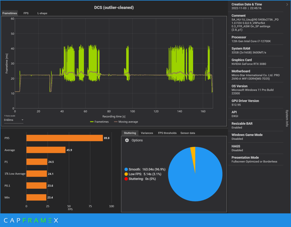 To give an illustrated example you can see below in picture 2 (South Atlantic map, single player settings), despite using 90hz, my system goes down to a minimum of 23 FPS. ASW is ON and mostly keeps up as the average is above 45 but in those moments where FPS are dropping you clearly see the ghosting.nullnull In picture 1 (Persian Gulf, single player settings) you can see that the system is always capable of producing at least 45 FPS and regardless of ASW being OFF I'm not experiencing any ghosting (as I said Oculus is always doing something on the background with ASW regardless of our choice) nullnullnull null