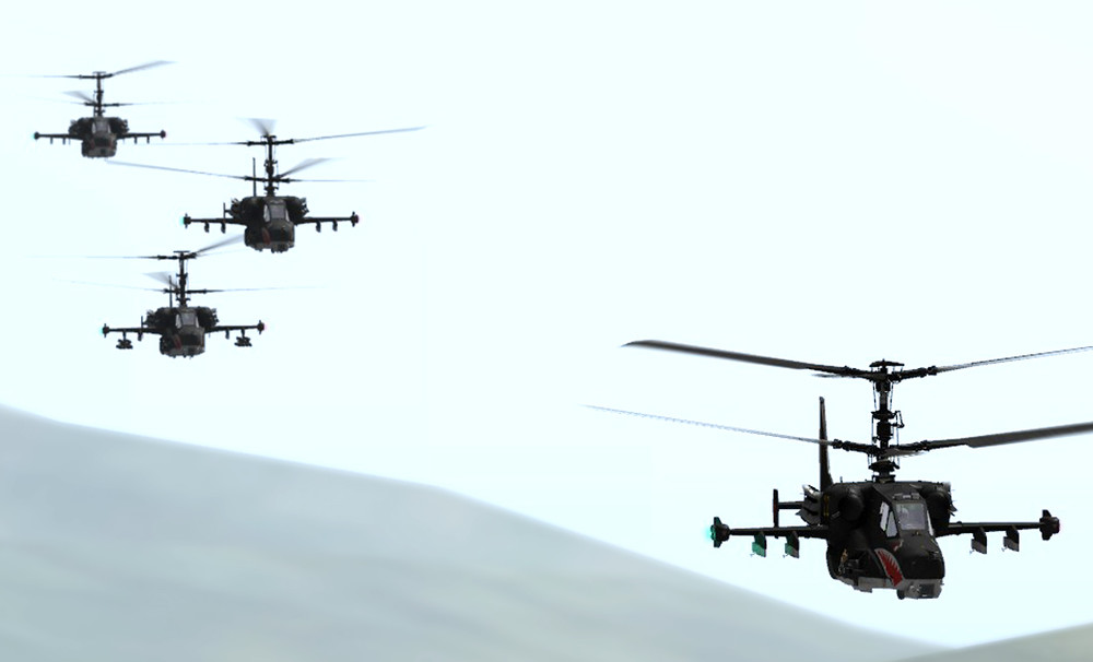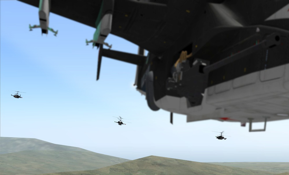 How many choppers you can fit into 4:3?) :thumbup: Nice thread MTFDarkEagle, I hope it will grow on tips for leading pilots aswell for wingmans. It is most important in a formation that all squad has the same trimmings and fly mode thus hard to setup in a freeflight conditions. I'm after takeoff switching into Route Autopilot mode for stable speed around 150km/h and heading. I'm aware that when HDG HOLD is disengaged before turn some force still left in autopilot and it creates small fluctuations of turning ratio. But still its safer than trimming for the whole turn as far as mine skill isnt there yet. I would welcome some advice for smooth flight transitions that are easy to comunicate throughout sqad?(ie. from hover to level flight and back to hover) With friend we use some codewords for cyclic and colective positions like levels1-5(first level means diamond shaped indicator stands on horizontal line and every other is one lenghth of diamond above or to side) as we can have similar takeoff setup and control reference for inflight corections. We started to fly on flyby waypoint mode so the autopilot does the job 100% corect if trimmed well. Fom there we continued to make the turns in desired heading hold with Heading hold OFF swithing On when disired heading reached. I hope now the trim through whole turn is at hand. I attach some screens form =STP=server: formation flight that answers the question -How many choppers you can fit into 4:3?) Track was bit broken but.... SKUNK, AirTom, 159th-Falcon, Sharkon in various positions.