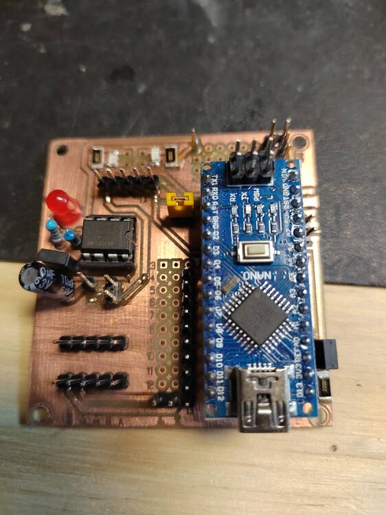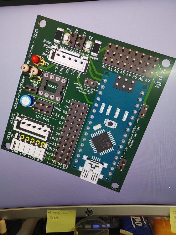 Thanks for your sharing, Vinc. Here's my possible new version of PCB (i use kicad). Is intended to be used with Nano (onboard) or,alternatively, Mega (wired). More, there is a rs485 through (from blue73 design). Possibility to feed Nano with 12 or 5 V (using a jumper) Jumper to power on/off the Max847 Jumper to enter in "onboard program mode" (i read on italian forum you need just to break the wiring RO→Rx to do it - hope is right). Btw,is it not enough to unpower the Max487? Max487 power led rx/tx led (with plugs to wire external led) 12V rail 5V rails Now I should make a prototype and test it. and someway fix my doubt on shielded/twisted wires (well, the distances could be important).... -