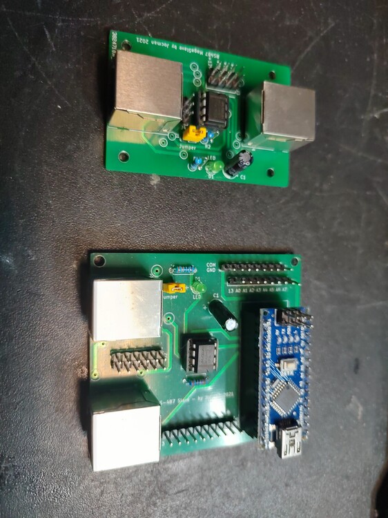 I made 2 interfaces. The one for the Nano hosts a Max487 chip (and the needed components), the connectors for the nano board and the pins for wiring the panels switches/leds/others. As the Nano board is very small, it is directly mounted on the interface PCB The one for the Mega board is smaller, as it hosts only the Max487 chip and the needed components. This interface is connected to Mega board via wires: the enabled pin for RS485 is the #2, while TX and RX are wired to TX1/RX1 pins. (attached the image of both the interfaces) With some dupont wires it's "easy" to connect "on the fly" the Mega board to the interface made fo the Nano and viceversa. This way I made the cross test, so I'm sure the interface for the Mega board works, thus the problem is the Mega board (i'm referring to a Mega board as slave). When I use a Nano with both type of interfaces, by pressing the physical button the virtual button is regurarly pressed. My plans are (or were??) to connect most of the panels to Nano boards, but for some panels (as the PVI800 keyboard) I'd like to use a Mega board via RS485 The RS485 master is obviously a Mega board direct via USB.