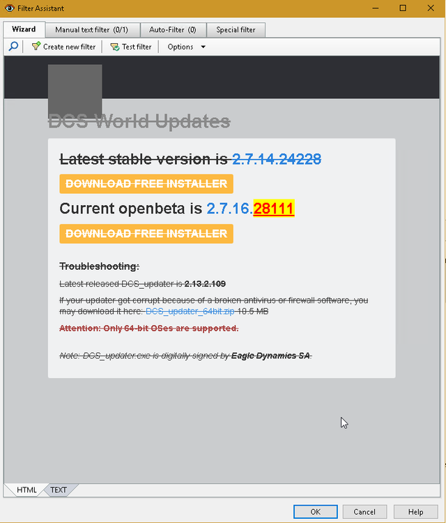 I just want to share a bat file I wrote to update DCS Server when a change is detected on the https://updates.digitalcombatsimulator.com/ site I am using a program called "Website-Watcher" to monitor for any changes to the specific text. Once a change is detected, it launches my bat file that shuts down any running servers, updates DCS, restores the missionscripting.lua file then restarts the servers. This script has worked wonderfully for the last three updates. I am using "Website-Watcher" to monitor https://updates.digitalcombatsimulator.com/ but any website scrapper that can launch a bat file will work. null echo Starting Update Tasks timeout /t 3 /nobreak :CheckDCS echo "Checking if DCS Servers are running" :: Update the Server names (Instance) taskkill /F /FI "WINDOWTITLE eq Dedicated-001" 2>NUL | find /I /N "Dedicated-001">NUL taskkill /F /FI "WINDOWTITLE eq Dedicated-002" 2>NUL | find /I /N "Dedicated-002">NUL taskkill /F /FI "WINDOWTITLE eq Dedicated-003" 2>NUL | find /I /N "Dedicated-003">NUL IF NOT %ERRORLEVEL%==0 GOTO RunDCSUpdater echo "DCS is still running. Checking again in 30 seconds." timeout /t 30 /nobreak GOTO CheckDCS :RunDCSUpdater START "" /high "C:\Program Files\Eagle Dynamics\DCS World OpenBeta Server\bin\DCS_updater.exe" --quiet update" timeout /t 30 /nobreak GOTO CheckDCSUpdater :CheckDCSUpdater echo "Checking if DCS Updater has completed updating" TASKLIST /FI "IMAGENAME eq DCS_updater.exe" 2>NUL | find /I /N "DCS_updater.exe">NUL IF NOT %ERRORLEVEL%==0 GOTO RestoreUnsanitizedMissionScripting echo "DCS is updating. Checking again in 30 seconds." timeout /t 30 /nobreak GOTO CheckDCSUpdater :RestoreUnsanitizedMissionScripting echo "Restoring unsanitized MissionScripting.lua File" START "" "C:\Windows\SysWOW64\xcopy.exe" /Y "C:\Users\Administrator\Saved Games\Mission Scripting Backup\MissionScripting.lua" "C:\Program Files\Eagle Dynamics\DCS World OpenBeta Server\Scripts" timeout /t 3 /nobreak GOTO StartDedicatedServers :StartDedicatedServers echo "Starting DCS Servers" timeout /t 3 /nobreak START "" /high "C:\Program Files\Eagle Dynamics\DCS World OpenBeta Server\bin\DCS.exe" --server --norender --webgui -w Dedicated-001" timeout /t 30 /nobreak START "" /high "C:\Program Files\Eagle Dynamics\DCS World OpenBeta Server\bin\DCS.exe" --server --norender --webgui -w Dedicated-002" timeout /t 30 /nobreak START "" /high "C:\Program Files\Eagle Dynamics\DCS World OpenBeta Server\bin\DCS.exe" --server --norender --webgui -w Dedicated-003" timeout /t 30 /nobreak START "" /high "C:\Program Files\Eagle Dynamics\DCS World OpenBeta Server\bin\DCS.exe" --server --norender --webgui -w Dedicated-004" timeout /t 30 /nobreak :: START "" /high "C:\Program Files\Eagle Dynamics\DCS World OpenBeta Server\bin\DCS.exe" --server --norender --webgui -w Dedicated-005" :: timeout /t 30 /nobreak echo "Update and restart of the dedicated servers has been completed" I hope this helps and pls share any other ideas, tweaks or other methods Shazzer DCS_Auto_Update.bat