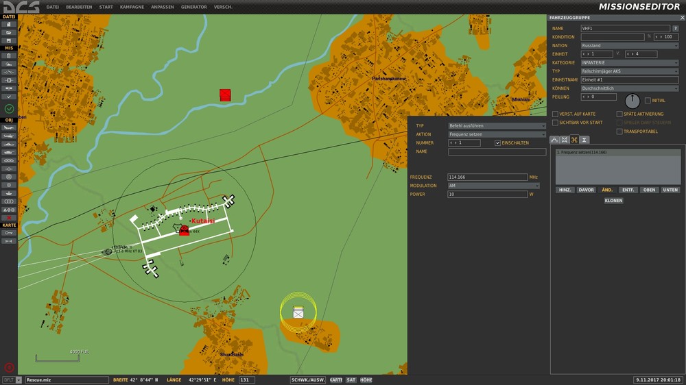 So ich habe es endlich geschafft. Nun funktioniert es wie gewünscht. Ich habe noch einen Fehler gemacht. Ich habe die Frequenz im Register "ausgelöste Aktionen" eingegeben. Richtig wäre es im Register "Route" Und das mit dem übermittlen, war ein guter Tipp. Als ehemaliger Uem Sdt sollte mir doch das auffallen:music_whistling: Hab noch ein weiteres Tutorial dazu gefunden: Habe die Miz noch eingefügt. Im fall der Fälle als Vorlage/Muster wenn jemand mal dass selbe Problem hat. Im übrigen its mir aufgefallen, dass in DCS 2.1.1 das ein und Ausladen mit dem Mi-8 funktioniert. Seit wann geht das wieder? EDIT: Danke für eure tolle Unterstützung Rescue 1.8.miz