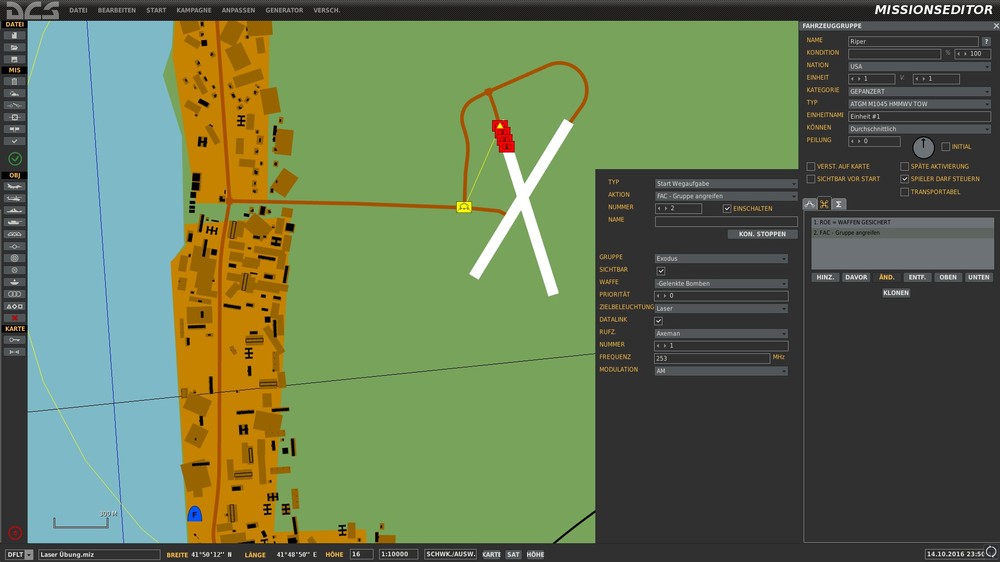 Irgendwie scheints irgendwie ein Bug zu sein. Ich kann nicht mal einen AWACS mehr anfunken wenn ich selber einen im Mission Editor setze. Das hat bis jetzt immer funktioniert. Interessanterweise funktionier es bei mwd2 seiner Mission. Ich kann auch die Elemente für das Lasern im Editor noch einfügen, die mir wie bekanntlich nicht angezeigt werden und speichern und es funktioniert. Aber das dieser BUG alle drei DCS Versionen betrifft 1.5, EA1.5 und 2.0? Ausser bei DCS 2.0 funktioniert das Anfunken von AWACS, aber JTAG nicht. Habe auch mal Spieler durch Client ersetzt. Hat aber keine Wirkung Kann mal jemand bitte unsere beiden Versionen bei sich testen? Dan weis ich sicher das irgend wo bei mir der Fehler liegt.