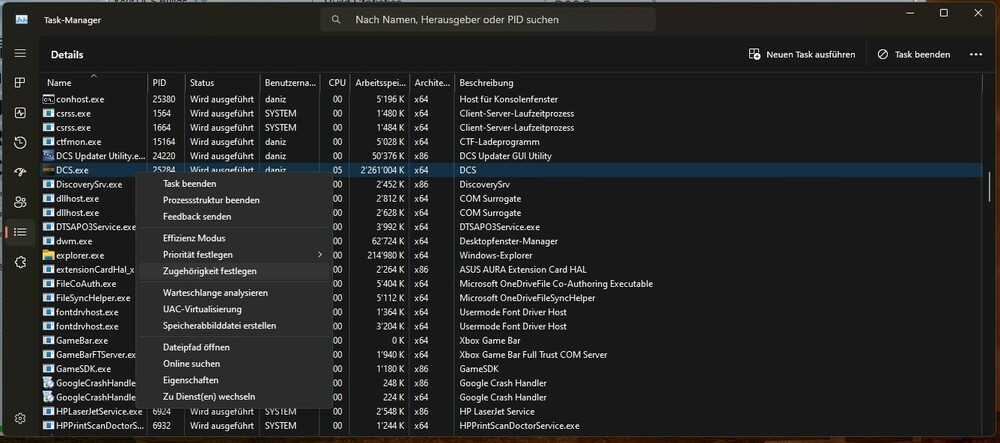 Ja ich komme dahin. Du musst den Eintrag DCS.exe suchen, dann mit der rechten Maustaste anwählen und die Option "Zugehörigkeit festlegen" auswählen. Dann kommst du in die Option Prozessoraffinität.null