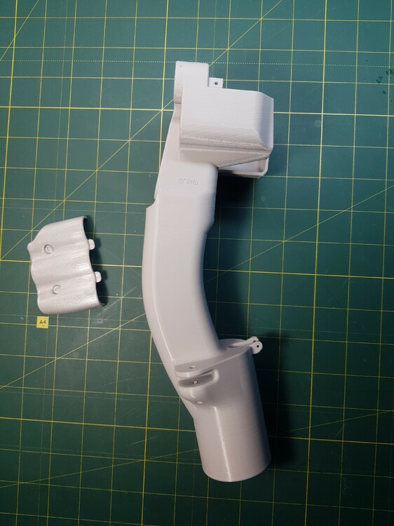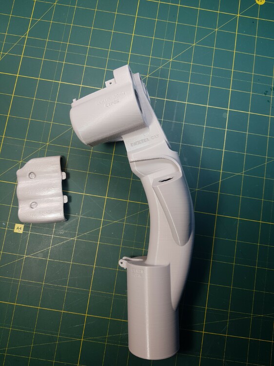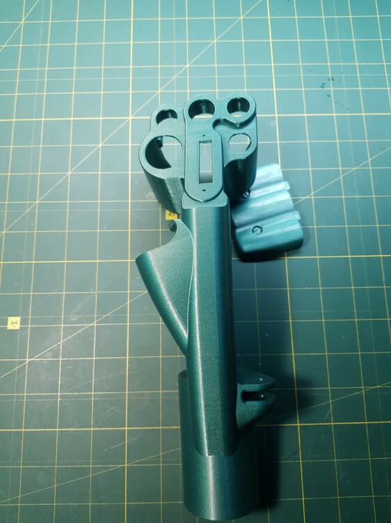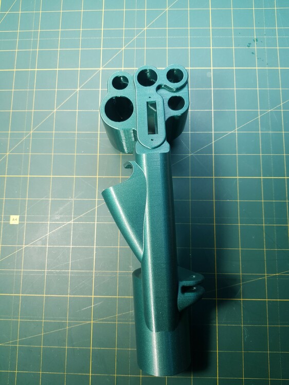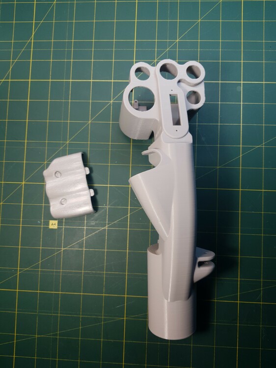 Была моделька РУСа Су-27, но увы там было много оплошностей... Была сделана 1 тестовая модель ручки Су-27, в итоге тонкие стенки, во вторых она с 2 половинок и в третьих 4 болта под крепеж. Было принято решение, взять за основу эту модель и изучить размеры, и нарисовать заново геометрию ручки. Была сделана тестовая цельная ручка, серого цвета, без внутреннего крепежа. На 3 ручки, зеленого цвета, уже были добавлены наработки, утолщение стенки и улучшение крепежа. Скорее всего на 4 модели, будут следующий доработки, крышка будет под болты М4 как и на оригинальном РУСе. Также под крепеж механизма курков, будут сделаны отверстия и утолщения.
