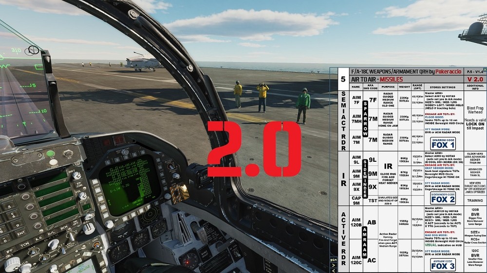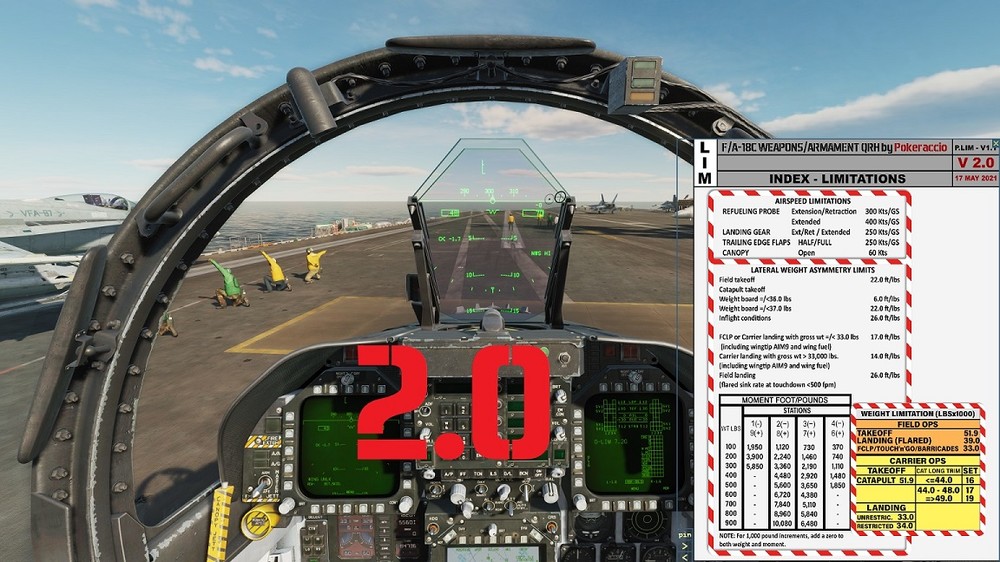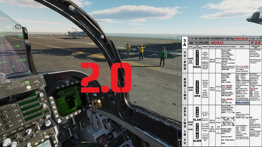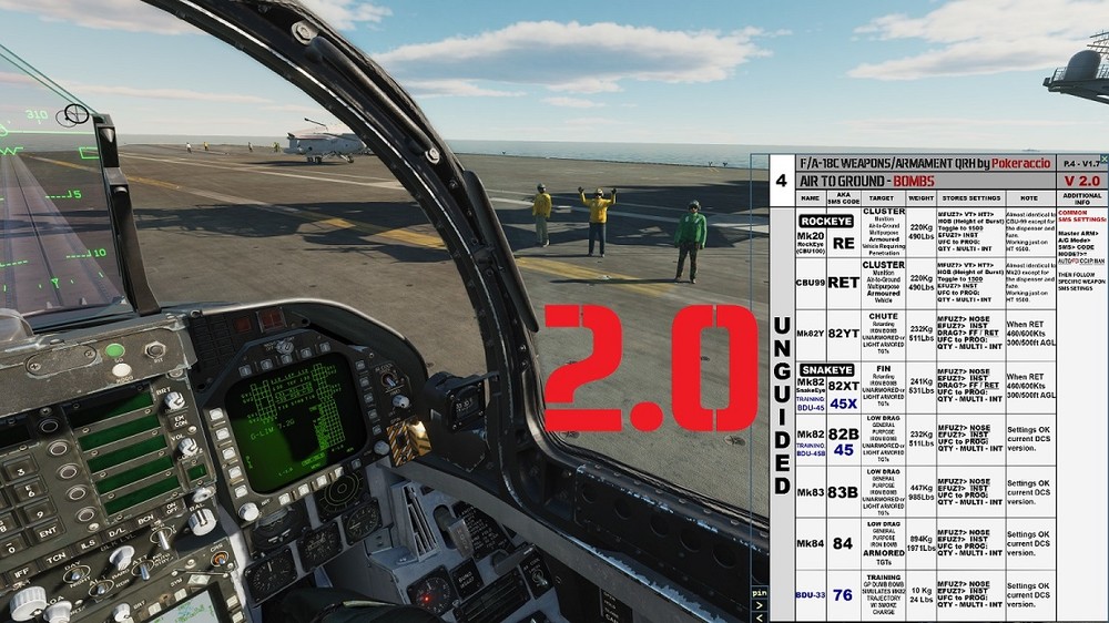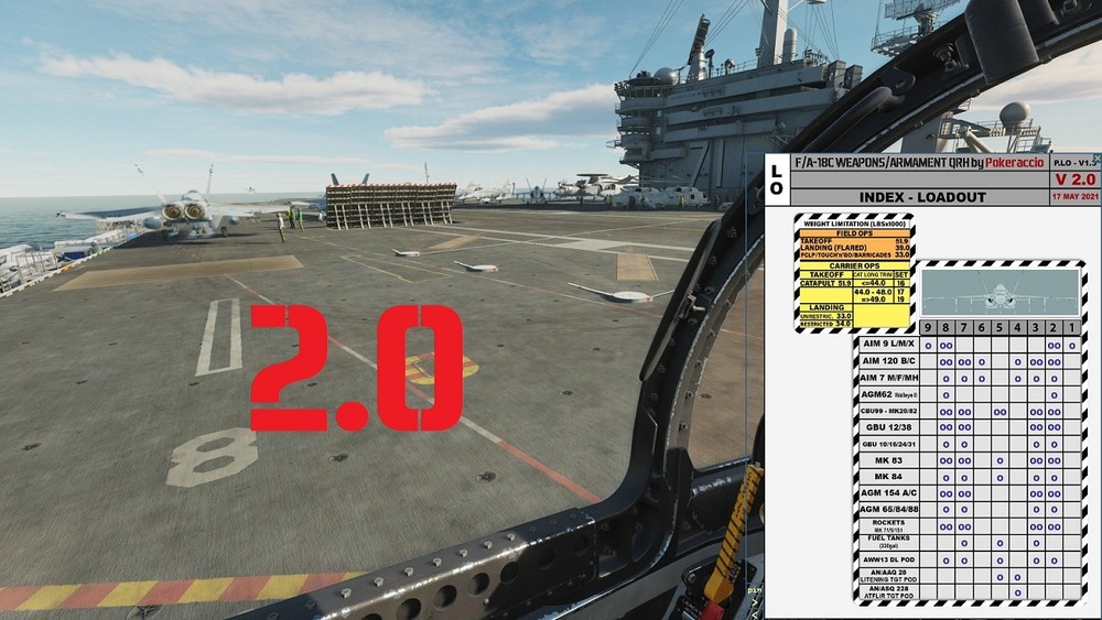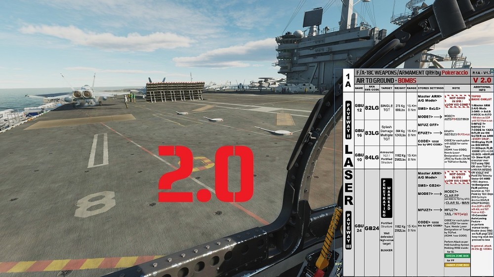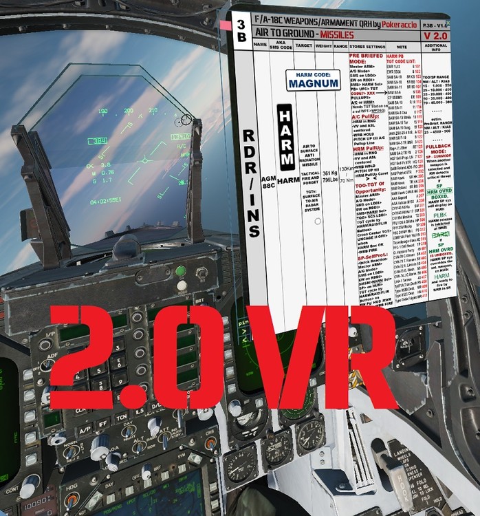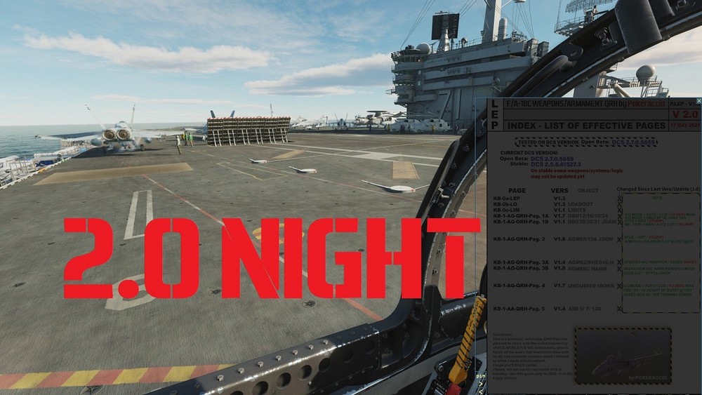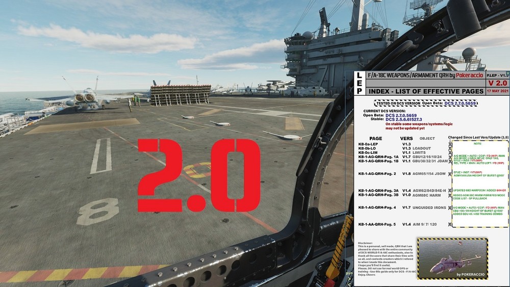 ***17MAY21 Update*** F/A-18C Hornet - Weapons QRH Quick Reference Handbook / Checklist / Kneeboard by Pokeraccio V.2.0 17.05.21 ***NEW VERSION 2.0 is here to celebrate the DCS 2.7*** Just a simple DCS F/A-18C Hornet Weapons QRH made up by 10 pages (+10 pages night friendly). Since update 1.7b added as a test 1 more page LIM (Limitations) also give it a sort of ipad look both clean/dirt version (removed since V1.8), to print or use as kneeboard with some useful info about F/A-18C Hornet Armaments/Weapons/Flight Deck procedure, very basic but handy especially during the first missions. Tested in Open Beta, used also in Stable just some feature may not be present, yet. If you need for any reason an older version drop me a line here on forum page. To have it in Kneeboard, just unzip and copy png files accordingly (if folders are not there, create new ones): \Saved Games\DCS\Kneeboard\FA-18C_hornet or \Saved Games\DCS.openbeta\Kneeboard\FA-18C_hornet The basic idea has been developed by others in various way, I just made my own version for personal use. As per request,(https://forums.eagle.ru/showthread.php?t=247119) I'd like to share it. I've uploaded the file in the user file section: https://www.digitalcombatsimulator.com/en/files/3305957/ ZIP file: 10 Png (+10 pages NV vers). this is a DAY/NIGHT PDF version: https://www.digitalcombatsimulator.com/en/files/3316602/ If you find some errors, update, DCS armament logic changes, anything please just share it here and when I'll get the chance I'll update them. Since release V1.3nv I added some Night friendly version for all the "Night lone wolf mission lover" out there... Cheers Pokeraccio My references and original ideas developers are: https://forums.eagle.ru/showthread.php?t=212282 by Chuck From page 140 Weapons and Armament section, on Page 143 there is a useful spreadsheet called F/A18C-Hornet Armament Matrix by Twisted-Biscuit https://www.digitalcombatsimulator.com/en/files/3305134/?sphrase_id=18908065 by Bailey https://www.digitalcombatsimulator.com/en/files/3304428/?sphrase_id=18908171 by Arinc429 https://www.digitalcombatsimulator.com/en/files/3300643/ and https://www.digitalcombatsimulator.com/en/files/3302559/ by Sydy https://forums.eagle.ru/showthread.php?t=189564&highlight=armament and also several You Tube Channels tuts by the well known gurus of DCS. I suggest also the very useful Windows APP Kneeboard Builder by AlaskanGrizzly https://forums.eagle.ru/showthread.php?t=129341 especially if you want to resize the Kneeboard Disclaimer: This is a personal, self made, QRH that I am pleased to share with the entire community of DCS-WORLD F/A-18C enthusiasts, also to thank all the users that share their files with us all, and contents creators which I referred to when I made this document. I hope you’ll find it useful. Please, DO not use for real world OPS or training - Use this guide only for DCS - F/A-18C Enjoy. Cheers by Pokeraccio Changelog: V2.0 -NEW VERSION is here to celebrate the DCS 2.7; -New document, layout, colors, graphics, overall adjustments; -Clearer Resolution, quite ok also in VR; -AGM-88C HARM PreBriefed Mode/Code List added; Self Prot. - PullBack Sub Mode; -BDU 45/ 45B Training Bombs added; -AGM-84H SLAM-ER added (so we'll be ready); -added one page and revisited page numbers; -Correction of inaccuracies in general on the whole document; -updated system logic up to Open Beta 2.7.0.5659. V1.9 -GBU-24 Paveway III added; -added one page and revisited page numbers -Some layout adjustments -correction of inaccuracies in general on the whole document V1.8 -AGM-84E SLAM added; -some small system update (TGP), -ZIP Content: PDF Frame vers, PNG Frame and No Frame vers, glass and dust version removed as not so useful (If you liked I can provide it). V1.7b -Small Update, correction of inaccuracies in general on the whole document, added as a test a new page on DAY version (Limitations), graphics enhancements with ipad look, dust and finger prints, both version clean/dirt available in zip. V1.7 -General Update, corrected SMS settings for Unguided Bombs, pages/color, added 2 page (total of 7 pages) on LEP-List of Effective Pages= changed/new pages List since last update V1.6 -General Update, pages/color/order/dimensions, added 1 page (total of 5 pages), added AGM-62 Walleye II Pages updated record: P1/5 v1.3 P2/5 v1.5 P3/5 v1.0 P4/5 v1.3 P5/5 v1.2 The same for Night Vers. V1.5nv -Update pages 2/4 and 2/4 NV with MAVF/TGP Checklist V1.4nv -Update pages 1/4 and 1/4 NV with a TGP Checklist V1.3nvBis -Update Store Settings for CBUs Page 3/4 V1.3nv -added Night friendly version V.1.3 - Page Order - switched pages 2 and 3 - Harpoon Added on Page 2/4