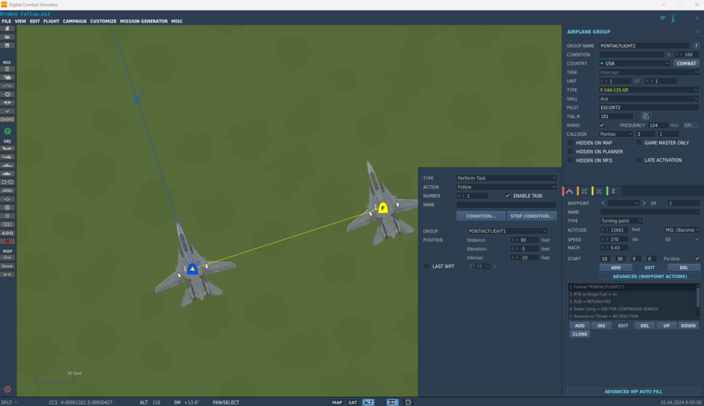 If there are 'hard' limits, then a) they should be communicated and b) the mission editor shouldn't allow you to set anything lower than those. However, I'd strongly suggest that any limits should be removed. If we want AI aircraft to fly very close (parade or aerobatic close formation) then we should be allowed to do so. These are supposed to be 80ft apart. They start that way, but immediately the AI aircraft that is FOLLOWING, spreads out, drops height and falls back into some default AI formation. Despite no formation data being specified on either aircraft. Broken Follow.miz ETA: This 'bug' or 'restriction' is present in all AI / NPC units, not just aircraft. Infantry and vehicles fall foul to this all the time.