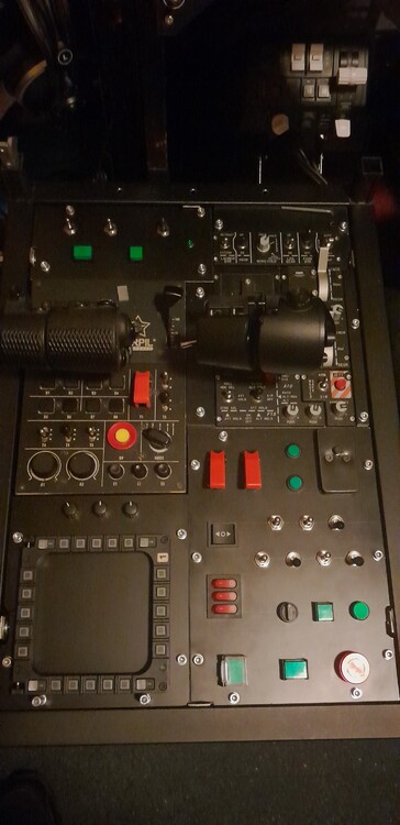 Some may remember a year ago, I was whining about the price of button boxes, which naturally followed in making my own, which resulted in this: Past year, I've been playing with Winwing Orion 2 and Virpil Mongoost v1, screwed down inline on an old speaker cabinet, not the best setup, having to reach almost behind me operating the Virpil throttles when flying the Mosquito, also no good platform to expand on (the cabinet was too small and actually had the Virpil hanging off the back), so that needed to change when the chance arrived Well, chance arrived when my company dumped some old modular displays, consisting of square steel pipes and connecting pieces This gave me a roughly 54x37 cm 'table' which could put the 2 throttles side by side, it was a little too high, but instead of the chore of sawing through steel 4 times, I opted to 'drop' the plateau on which it all was screwed, which lowered my throttles level with the edges, of course this left 2 'cavities' forward and back and I, for the time being, filled them flush with 1mm plastic sheet Using a front plate designer on the PC and the plastic sheet as template, began working on designing and adding a button board, at work found an old +/- 4mm 'address board' that used to be screwed to the gate, which was plastic reinforced with laminated aluminum foil, perfect for my plan When I had some drafts, I got (another) Bodnar BBI-64, went shopping in China for various switches and buttons, started puzzling the RL layout and found I had way more space than I had connections on the BBI, but I still had a TM MFD lying around and figured I could add its functionality and fill space with it So far, this is the result: Though still mostly built by hand like my first try, this time, I put in a bit more effort/precision in the actual drilling of the holes (still won't win any beauty contests up close ) Modeled some configs from the F-14, like the top left plate has engine L/R start and inlets (since it would be above the Virpil and furthest to reach, figured I wasn't gonna populate it too much), the AFCS toggle layout, a 4-way hat as Target Designate Switch, and the rudder trim (unused in DCS) on the bottom right panel For fun also put in an emergency stop button (probably will be using it as ejection seat arming) Still need to work on the bottom left panel, the encoders need to be soldered and connected (that 'area' combined with the Virpil rotaries and axes will function for radio's and volumes), after which I'm gonna ponder what I'm gonna put in the space inside the MFD as I will still have some 10 terminals free on the Bodnar Now I also need some solution to power the led-equipped buttons, the Bodnar apparently can only do 1 led
