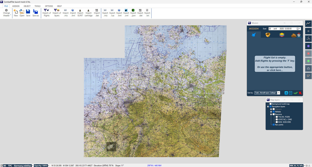 In military aeronautics, a good flight planning accounts for almost 90% of mission success... And for that, we are fortunate to have a dedicated software for DCS World: that's CombatFlite. It has proved to be an essential tool for flight planning and mission creation, from the simplest to the most complex ones. Unfortunately, it seems that updates to this software have now been discontinued, and it is unlikely that a dedicated theater will be created any time soon. The only option we have is to modify an existing theater and manually integrate the data we need. This is the path I've taken, and I've decided to modify the “Persian Gulf” theater to include mapping of the Afghan theater, as well as the data required to use all the software's functionalities. In the coming weeks, I'll explain you how to do that, and I'll direct you to the necessary files to let you use CombatFlite on the Afghan theatre!