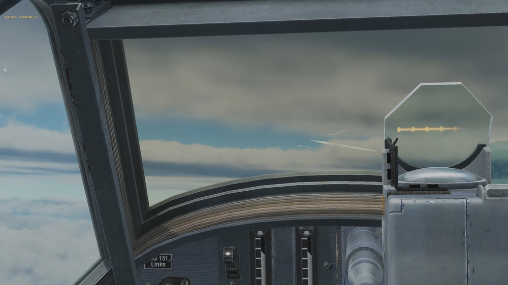 1. It is really annoying that you have to zoom in to see contrails you should be able to see clearly from afar. I have visibility set to extreme (highest possible setting) and still they pop in and out. I reckon this is for performance reasons, as it is clearly distance-related, but there should be a setting to disable it, if the machine can handle it. Here are some screenshots I captured yesterday: First the cockpit perspective at around default zoom: Clearly visible a single contrail left of the gunsight. This contrail is clearly visible at all zoom levels. Now, when zoomed in a bit, still only the single contrail: Zoomed in a tiny bit further and boom: a whole bomber formation and another contrail just pop in: That the contrails appear to be drawn in front of the cloud layer below is another issue, but I'm guessing that is due to the new cloud tech and not final. The (dis-)appearing contrails however have been there before version 2.7.