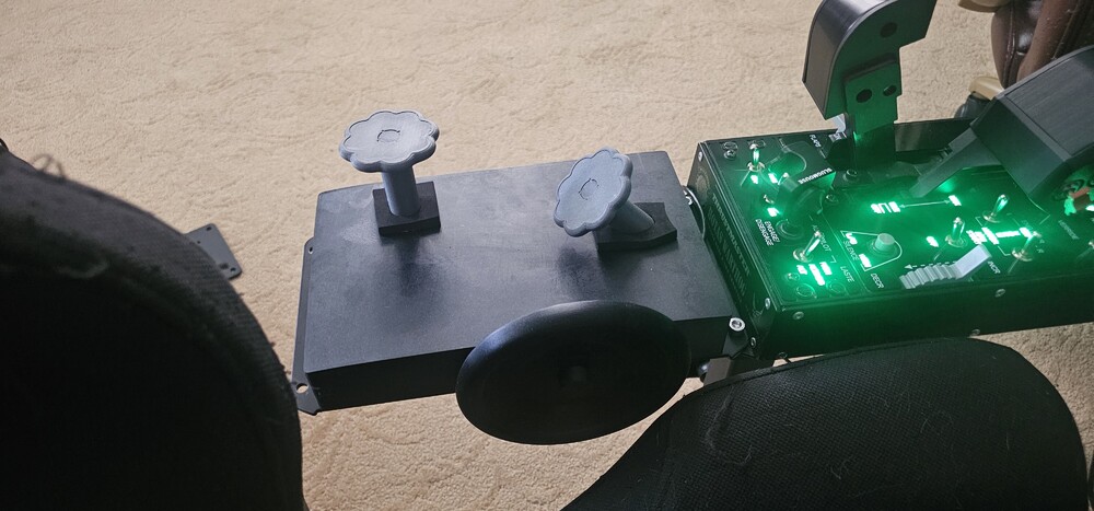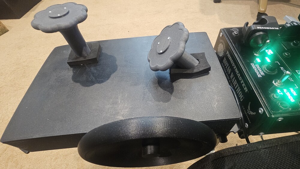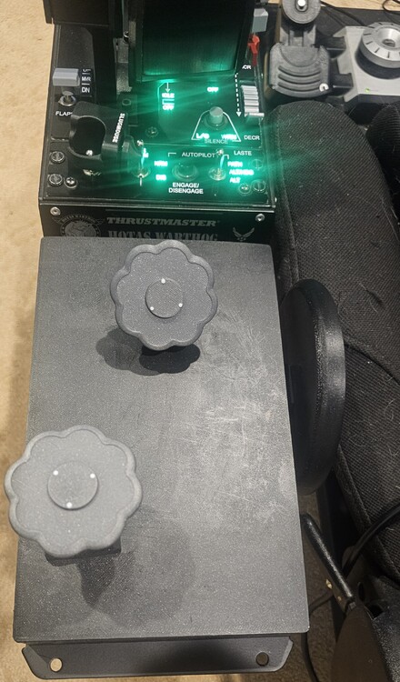 Corsair is the first warbird I've gotten serious about, mostly been flying the Hornet. I found mapping the Corsair trims to hat switches felt less than ideal, so I decided to cook up some trim wheels. This uses three B10K rotary linear potentiometers ($10 for a 10 pack on Amazon), an Arduino Micro ($23), and the parts were printed out of PLA (less than $10 in filament), USB micro to type A connects it to the PC. I drew the wheels and box in CAD, had ClaudeAI help with the Arduino code and now I have a functional set of trim wheels, each assigned to an axis. null The wheels turn more or less the same amount as the wheels in the virtual cockpit, and placing it behind the throttle means my hands are pretty much where they show up in sim (using leap motion hand tracker). I don't know how long these cheap pots will last, but they work well now and the code filters out noise so they generally do what they're told to do. This is a first prototype, so its still a little janky. The neoprene pads around the wheel stems are there to increase friction. Working on a more elegant, internal solution. The wheels are a little smaller than the real wheels, next set I will make a little larger and may print them out of transparent polycarbonate. They are unmarked as I am always in VR, but putting position markers on them wouldn't be hard. Considering putting a tailwheel lock on a future version too. Sharing this just to see what other ideas people have to improve upon it, and I'm happy to share the CAD, code, and wiring if anyone wants to build something similar. This works for the P47 too and a similar setup could be adapted to pretty much any warbird.