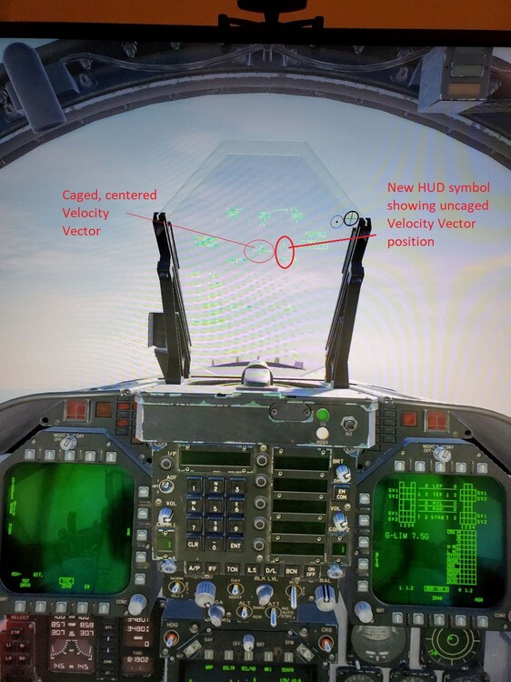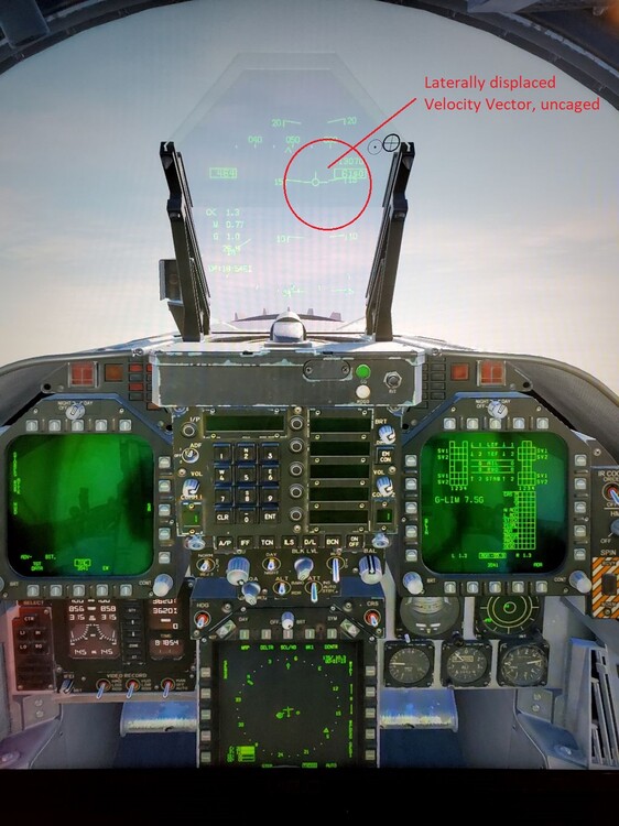 In the HUD, the Velocity Vector and Pitch Ladder becomes displaced to one side or another (left or right of centerline, to various amounts of offset). I first notice it flying when the HUD's uncaged. When caged, it centers the VV but then there is a new symbol (the three lines of the VV without the center circle, a 'ghost VV'(?)). The symbology is accurate as the Hornet's flight path is slipping in that direction. Very obvious close to the ground or trying to land. See pics The error is with the heading system (AHRS/INS?). The lateral displacement is heading dependent; the amount varies based on heading, and turning through 180 degrees will move it from left to right or vice versa. Its like a type of misalignment It happens in both cold/hot missions that start on the ramp, and ones that start in the air; even in training missions starting in the air, where I did not perform the startup and assume the sim set everything up correctly. I see no external damage and the FCS page shows nothing either. On cold starts, I usually do the Stored Heading when aligning the INS to save time, and figured I was doing something wrong. I wait til the '0.5 OK' appears and the 'INS DGRD' is gone - completing the 90 second alignment. But it also happens after the full 8 minute alignment. IFA (In Flight Alignment?) doesn't fix it. It's been there from after takeoff, and has also appeared after maneuvering. It doesn't happen all the time but often enough, and now it happens when I didn't do the start up, so I'm at a loss. Will INS IFA fix this over time? Is there a reset? I've hit the trim reset button and it doesn't do anything for the issue. If you have any help I'd appreciate it, and thanks again. Merry Christmas!