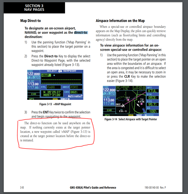 Hello! Having used the real counterpart to the NS430 quite a lot, I am requesting a feature to be added to the cursor when in map mode. Currently: When you activate the cursor when in the map screen and move the cursor to any arbitrary location and press the Direct-to -button, the NS430 presents you with either your current location (the airfield you are at if you are on the ground) or alternatively the point that the cursor is over (though this bugs out at times). Request: As per the real device, if you set the cursor at a point on the map where there are no waypoints (user generated or otherwise) the device should present you with a new user waypoint marked "+MAP" with the current cursor coordinates. This allows the user to set their destination quickly to any point on the map without needing to first navigate to the user waypoint menu and then build a new waypoint by setting coordinates. The following picture is taken from the official GNS430 manual (https://static.garmin.com/pumac/GNS430_PilotsGuide.pdf) Regards, MikeMikeJuliet
