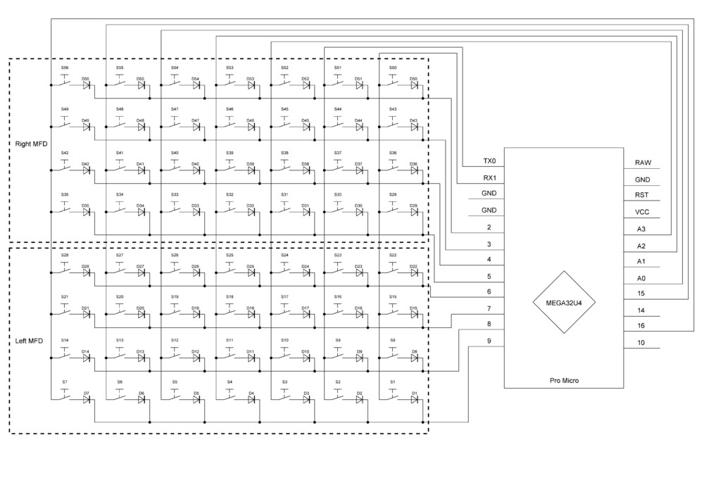 Всем привет. Некогда посетила меня идея попробовать сделать с нуля MFD панели как у F-16 с дисплеями. Хочу поделиться с сообществом результатом моих экспериментов. Возможно этот пост вдохновит на создание подобных элементов кокпита других вирпилов или может кому-то поможет упростить этот процесс, получив большую часть необходимой информации в одном топике. Вдохновило меня на это - видео от GENA PILOT: Настройка LCD экранов под TM COUGAR MFD для DCS. Идея заключалась в следующем: На 3D принтере сделать рамки MFD панелей с кнопками. На базе одного Arduino сделать схему джойстика на 56 кнопок под 2 MFD панели. Запрограммировать Arduino с помощью MMJoy. Разработать схему печатной платы под тактовые кнопки, которые поместятся в MFD рамки. Сделать печатную плату из фольгированного текстолита по ЛУТ-технологии. Найти подходящие LCD дисплеи на Ali Express и собрать все в кучу. Настроить кнопки и отображение MFD экранов из DCS на LCD дисплеях. 1. 3D печать рамок и кнопок. За основу были взяты 3D модели рамок с сайта: https://www.thingiverse.com/thing:3327543/files. Однако, модель имеет не оригинальные размеры, поэтому модель пришлось подгонять под чертежи. Кроме того, в модели есть множество мелких и не очень нужных элементов и пазов, которые могут криво напечататься, а использовать мелкие сопла или более дорогие виды пластика может существенно увеличить цену изделия. Также кнопки не имеют фасок и кнопки-качалки плоские, а в реале они вогнутые. В общем, методом тыка и с помощью какой-то матери я подогнал 3D модели под свою задачу убрав лишние и плохопечатуемые детали, а также немного улучшив модели кнопок: 3D модель MFD рамки 3D модель квадратной кнопки 3D модель прямоугольной кнопки-качалки Рамки решил печатать черным пластиком, а кнопки - прозрачным, с расчетом на то, чтоб сделать им еще подсветку. Важно! 3D модели кнопок имеют размер 1 в 1 под отверстия в рамке, поэтому их нужно печатать в масштабе 95-94% от оригинала, чтоб был зазор, иначе кнопки придется долго и нудно обтачивать на этапе постобработки, чтоб они "сели" на свои места в рамке. Результат получился таким: 2. Arduino и схема подключения В качестве основы для контроллера джойстика решил взять Arduino Pro micro на базе чипа ATmega32U4. Девайс вроде минимальный по размерам, а контактов достаточно для создания нужного числа кнопок. Каждая MFD-панель имеет 28 кнопок, соответственно для двух панелей необходимо по крайней мере 56 кнопок. В Arduino для настройки множества кнопок применяются схемы в виде матрицы состоящая из "строк" и "столбцов". Выглядит это примерно таким образом: Как видно из схемы для каждой кнопки также нужно подключать диод для того, чтоб Arduino смог определять какая из кнопок в "строке" нажата. Путем нетрудных расчетов для получения 56 кнопок нам необходима матрица из 8 строк и 7 столбцов. Итоговая схема для 2 панелей у меня получилась такой: 3. Программирование контроллера с помощью MMJOY Для программирования контроллера я использовал информацию и софт с сайта проекта mmjoy. Вкратце опишу процесс подключения, настройки и загрузки прошивки в контроллер исходя из текущей схемы. Скачай архив с актуальной версией MMJOY2 и распакуй в корень диска C (не рекомендуется, чтоб в пути к MMJOY была кириллица или пробелы). Подключи плату контроллера Arduino к компьютеру. Устройство должно определиться как Arduino Leonardo и должны установиться драйверы. Если драйверы не установятся, то установи их вручную че