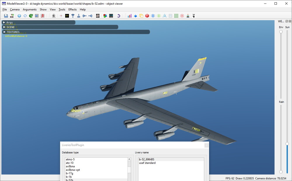 Hi all, so I have been trying to create some basic reskins from the DCS template by turning off and on certain layers to change the tail/unit designations and resave and export the files to put into their individual livery folders. So I created the 4 units 69th, 93rd, 96th and 343rd; I also used model viewer 2 to create a basic LUA file for each folder/texture but only the first folder/livery for the 69th showed up and this livery still wont let me turn off the default markings (still with the new ones underneath). I have been watching tutorials for skinning but I cannot find anything covering how to write the description.lua file to turn off the defaults. So here is what the model viewer created: livery = { {"texture B-52_Okras.bmp f2 g0", DIFFUSE , "B-52_Okras", false}; {"texture b-52_okras.bmp f2050 g0", DIFFUSE , "B-52_Okras", false}; {"texture parashut.tga f2 g0", DIFFUSE , "parashut", false}; {"texture LONGER-DAMAG.bmp f2 g0", DIFFUSE , "LONGER-DAMAG", false}; {"texture USAF.tga f2 g0", DIFFUSE , "USAF", false}; {"texture c130-fon+flag.bmp f2 g0", DIFFUSE , "c130-fon+flag", false}; {"texture nomera.tga f2 g0", DIFFUSE , "nomera", false}; {"texture BANO.tga f0 g0", DIFFUSE , "BANO", false}; {"texture BANO.tga f0 g0", SELF_ILLUMINATION , "BANO", false}; {"texture DAMAGE_All.tga f2 g0", DIFFUSE , "DAMAGE_All", false}; {"texture DAMAGE_All.tga f2050 g0", DIFFUSE , "DAMAGE_All", false}; {"texture HOLES_All.tga f2 g0", DIFFUSE , "HOLES_All", false}; } I changed all but the first two false arguments to true and it picks up the new texture but still won't turn off the default markings. Is this template just too old for 2.5 or am I just doing it all wrong? Any help is very much appreciated. Cheers, Scotty.