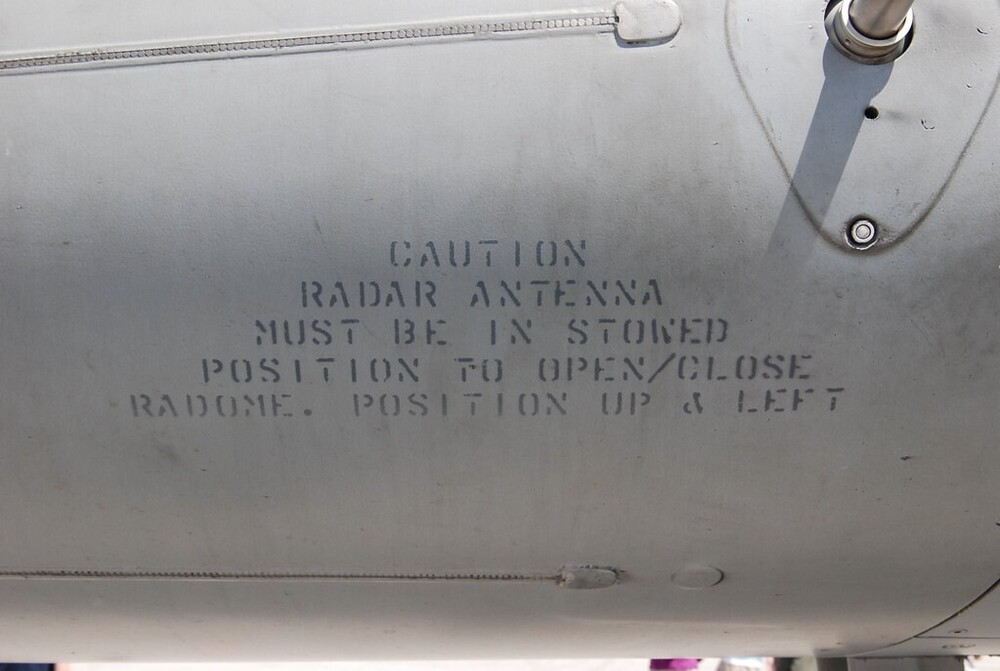 The text on the radome for all base game F-16 liveries is incorrect. The in-game image provided is from a custom livery, but uses a base game livery as the basis. It is also incorrectly mirrored on both sides on base-game liveries, whereas IRL, it should only be on the left hand side, as that is where the radome hinge is to open the nose. An image of the correct text of what should be displayed has been provided, and incorrect grammatical errors have been highlighted. Here is a transcript of what is currently displayed: "RADER ANTENA MUST BE IN STORED POSTION TO OPEN CLOSE RADER DOME POSTION UP LEFT" What should be written: "CAUTION RADAR ANTENNA MUST BE IN STOWED POSITION TO OPEN/CLOSE RADOME. POSITION UP & LEFT"