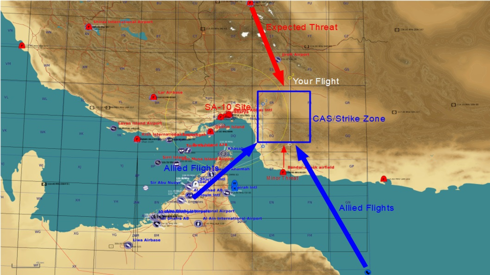 A new mission is available on the users files: https://www.digitalcombatsimulator.com/en/files/3315288/ Iran and China have entered an alliance of mutual support which has bolstered Iran's influence in the Persian Gulf. As a result tensions between this alliance and the US and Europe escalated to the point of war. This mission is set early in the conflict and involves providing CAP for ground attack flights. Fly a F-16C 4 ship armed for air to air into Iran and prevent red fighters from interfering with blue strike groups. Red forces are randomized as are some blue forces for replayability. DCS version 2.5.6 (stable) Please report any issue or bugs to my by PM, thanks.