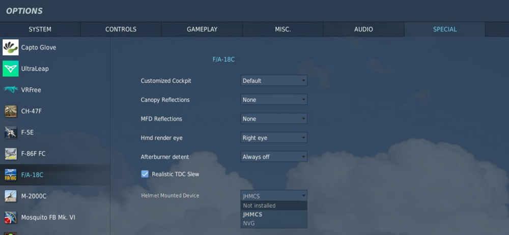 nullwith the cold war upon us, it would be nice to be able to select no HMD in jets like the hornet. Currently only NVG or JHMCS are available to the player through the ground crew and restricting them is impossible (i have a script that blows you up after take off though ). I did a quick mock up of what it could look like. Also a check box in mission options to ENFORCE MISSION HMD SETTINGS to allow for late 80s early 90s PvP environments.