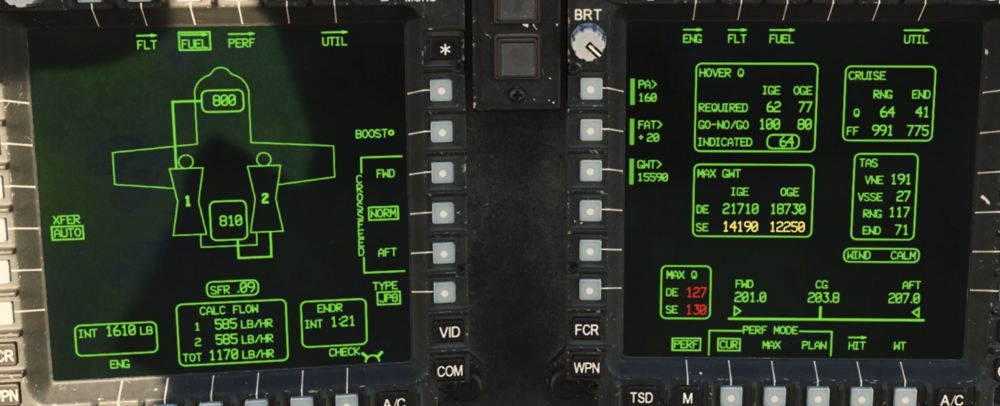 1. Cruise and TAS boxes don't really correspond well in regard to RaNGe and ENDurance. In my example best range Q is shown as 64% TRQ in the Cruise box, while the TAS box is showing 117 kts as the maximum range speed. Max endurance Q is supposed to be 41% at a speed of 71 kts. Lets focus on maximum range speed, 64% at 117 kts. Bottom line is, these tandem values are impossible to achieve in DCS. With a TRQ of 64% I merely achieve 104 kts in level flight (I even allowed a slight descend to keep that speed), so around 12% lower speed than required for maximum range as per the TAS box info. Also the fuel flow in the Cruise box for 64% Q is predicted 991. Checking on the Fuel format page, the calc flow for the current 64% is 1170 in total, which is 18% above the prediction of the PERF format page. Brad mentioned in discord that drag can affect the values. But I am a bit surprised to see the deviations being that enormous. Even in case the prediction fails to be accurate, how can predicted Q and speeds mismatch that far? No, I can't provide any real world data on "how it should be". Rather I am clueless if this is wanted as designed and want to bring this to your attention in case a further refinement is required. Its the size of difference, which lets me doubt that this is correct. Yet maybe it is? If these deviations are realistic, I am curious how the PERF data can be of use in any meaningful way IRL when in fact the values are unreliably off from the actual state of your flight. I wouldn't even know what to actually aim for when attempting maximum range flight, 64% torque or 117 kts? Or are these parts of the PERF page ignored IRL due to their inaccuracies and at least for maximum endurance I rather have to rely on the SFR of the FUEL page? This is a few moments of my flight, before the screenshot above was made. (unlisted video)