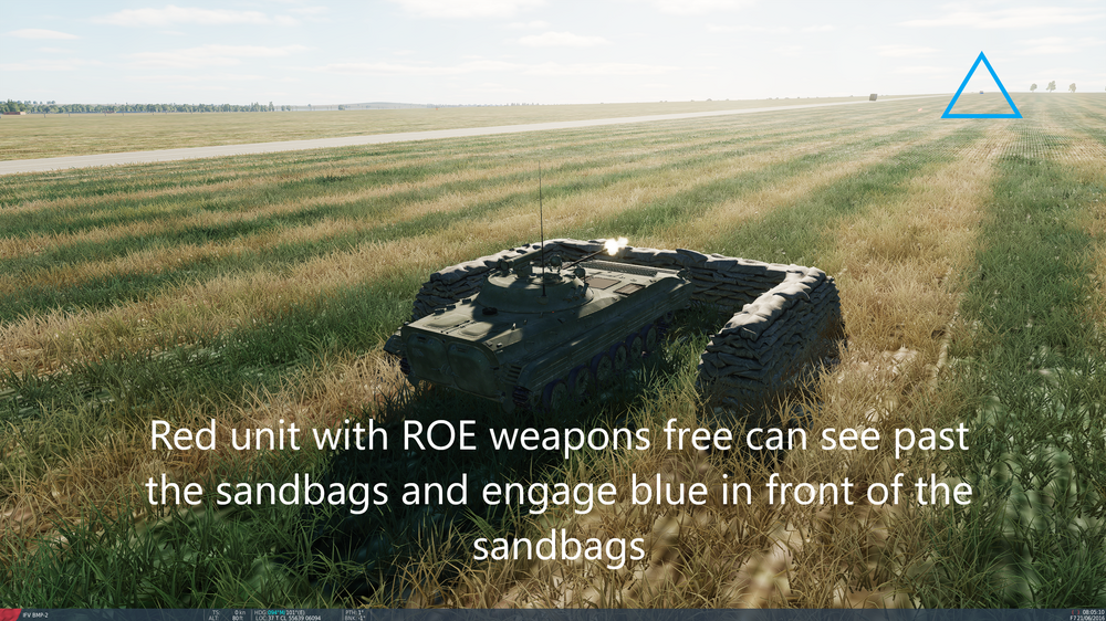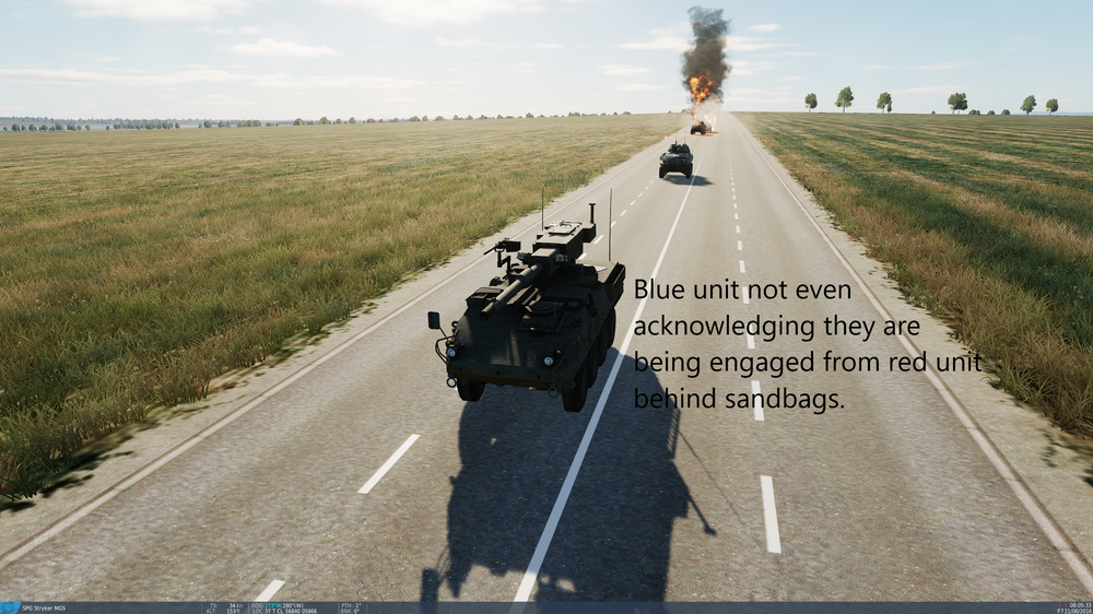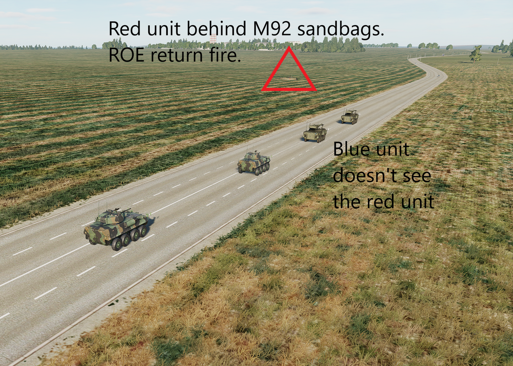 Ground vehicles set behind the M92 sandbags to make it look like a fighting position become almost "invisible" to the other AI ground units Set up: Blue convoy: Weapons Free, skill: Excellent. 2x MGS(highest main cannon) 2xLAV Red defense: Weapons Free, skill: Average. 1xT-72, 1xBMP-2. Test 1: Both red units behind M92 sandbags. Blue convoy was engaged and destroyed while never engaging red. Test 2: Removed sandbag from T-72 position. Blue convoy saw T-72, engaged and destroyed T-72 from over 1km away. Was engaged from Red BMP-2 while never acknowledging they were being engaged. Blue Convoy was within 300 meters of red bmp-2 with a clear LOS of the bmp-2 but never saw it. Test 3: Removed sandbags from both T-72 and BMP-2. Blue convoy engaged and destroyed T-72 from about the same range as Test 2. When blue convoy found bmp-2 they engaged and destroyed it before the BMP could engage them. EDIT: December 25th. Still a issue after the new patch. Images and trackfile are from tonight. Made a simple test mission for you as well so its easily repeatable. nullM92 sandbags(WITHOUT).trkM92 sandbags(WITH).trkM92 sandbags(WITH&ROEFREE).trkM92 Sandbag test.miznullnullnull