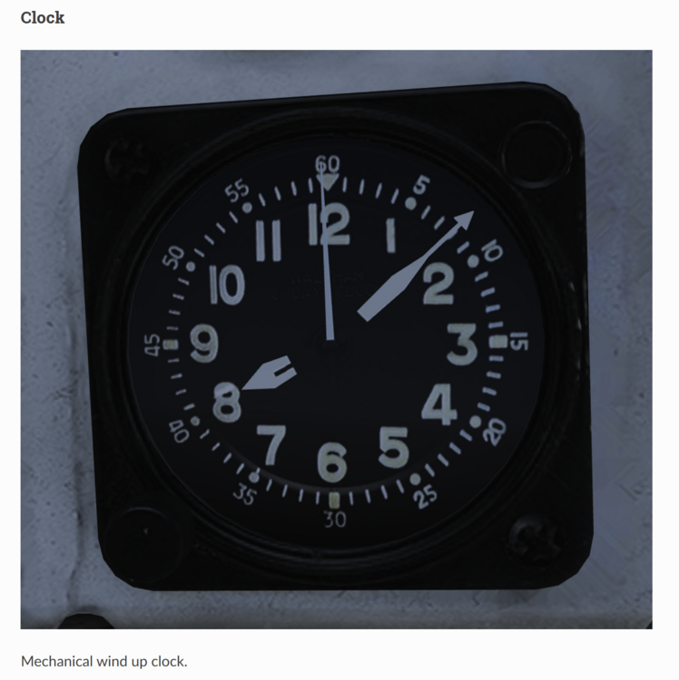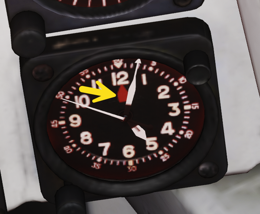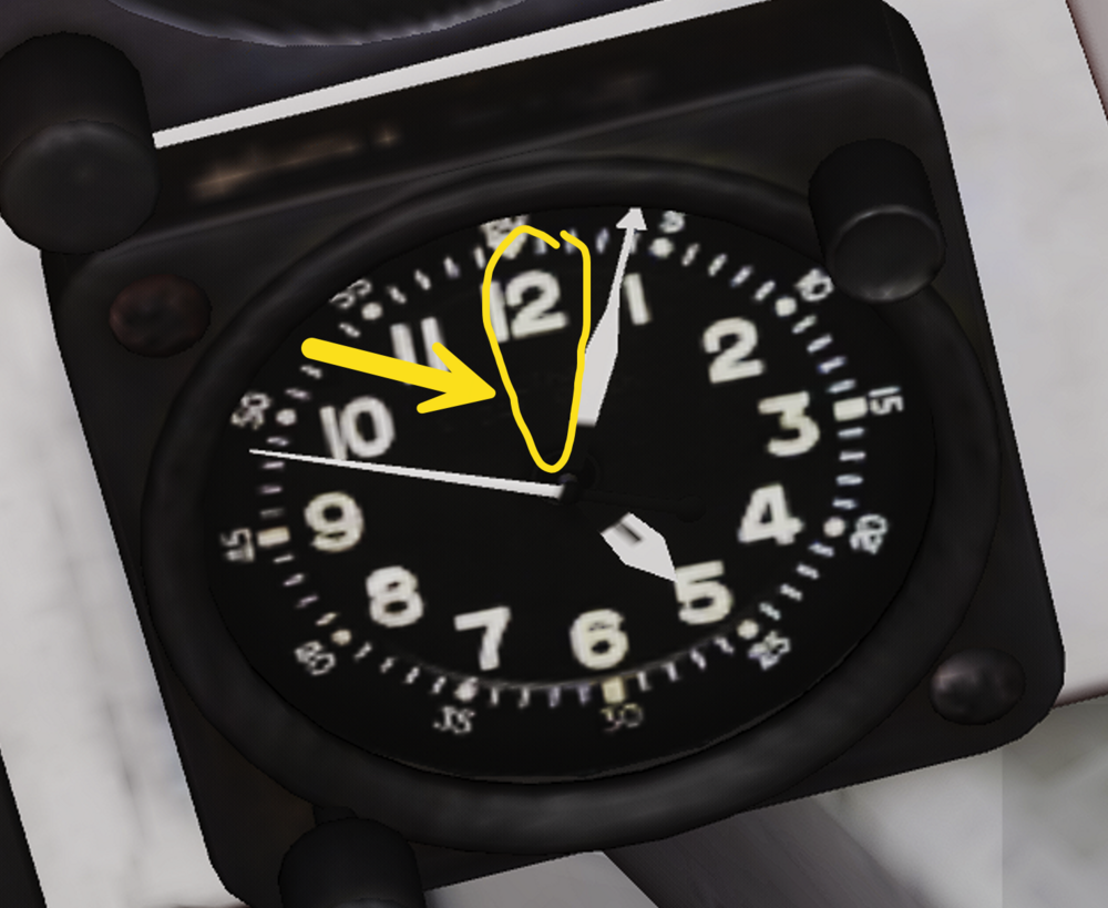 Hi, @JupiterJoe has pointed out an interesting finding about the clock shows differently when the instrument light is on and off at day and night. According to HB manual about the pilot cockpit clock at: https://heatblur.se/F-14Manual/cockpit.html#clock The test case 1: instrument light is on in the nighttime (flashlight is on) I see the red pointer. Test case 2: instrument light is off in the nighttime (flashlight is on) Test case 3: instrument light is on in the daytime (flashlight is off) Test case 4: instrument light is off in the daytime (flashlight is off) The clock shows exactly same in the HB manual shows. Hi @Silhou, sorry for bothering, and it is only shown when the instrument is on? Thanks.