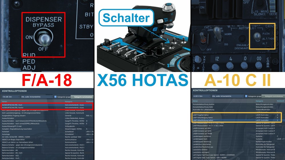 Guten Abend DCS Gemeinde Was mir schon bei vielen Modulen (Flugzeuge) aufgefallen ist, dass es gewisse Schalter gibt, die man mit für die es die Option hoch und runter gibt. Als Beispiel der Auswurfschalter (Düppel und Fackeln) der F/A-18 Hornet. In Verbindung mit der Funktion «In Game» kann ich die Schalter über meine Schalter am HOTAS steuern. Fehlt so eine Funktion dann muss ich z.B. für jede Schalterposition einen eine Schalterstellung auf dem HOTAS belegen. Wenn ich Pech habe, dann springt der Schalter «In Game» zurück. Meine Schalter auf dem HOTAS haben eine fixe Mittelstellung – Schalter am HOTAS nach vorne drücken und er springt wieder zurück. Bei der A-10 habe ich dieses Problem mit dem Autopilot-Modusschalter. Kann man in der Config was machen, damit ich durch die Schalterstellungen hoch und runter schalten kann? Evtl. eine alternative Software? Danke im Voraus.
