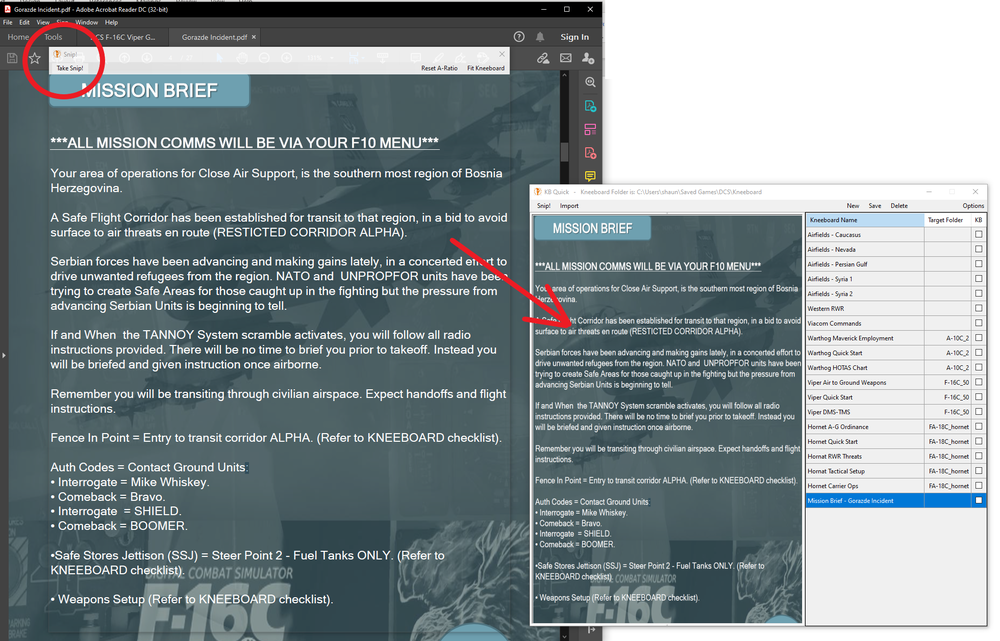 KB Quick is an all-in-one app to quickly and easily create and edit kneeboards, organise them, associate them with aircraft, quickly select and publish them for specific training/mission requirements, and easily re-edit and re-publish them with a few clicks. I realise there are other excellent kneeboard utilities, I developed this one for my own training needs and have decided to share it here in the spirit of DCS forums. Please download from here : https://www.digitalcombatsimulator.com/en/files/3315463/ Features All-in-one kneeboard creator/editor/manager/publisher Rich Text editor (one or two columned) Basic instant conversion to Night Operation versions Kneeboards are managed as .rtf files and can be quickly selected and re-edited Easy association of kneeboards with specific aircraft One-click selection publishes or removes kneeboard image to/from appropriate DCS kneeboard folder Snipping Tool-like, screen area capture directly into kneeboard page Import existing kneeboard images The program is easy to use but I would highly recommend that you give the pdf manual, included in the download, a once-over before you start for detailed usage and configuration information. It does NOT access any DCS World folders other than your saved games Kneeboard folders only when you choose to write kneeboard images. All of its kneeboard data and configuration files are stored in the “KBQuickFiles” folder, which it creates in your “Documents” folder. The software is and will always be free. All feedback is very welcome. Please report any bugs. *** Version 1.1 : Fixed minor bug in which the image of the message box which asks "Save changes before changing kneeboard?" gets captured into the kneeboard image. *** Version 1.2 – Improved app appearance for displays using >175% Windows Text and App scaling (typically 4K monitors and high-resolution laptops). Thanks to Backy 51 for assistance. Added Context menu Functions: Undo : Undo last editing action Colour | Choose Colour : pick any colour for selected text/insertion point Highlight Colour: Pick any colour to highlight selected text Background Colour : Pick any colour as kneeboard background Version 1.3 – Added unlimited undo/redo levels. Improved Snip! window edge visibility. Updated manual. Version 1.4 – Added basic table creation and editing Right-Click and “Insert Table” to create 2,3,4 or 5 column, single row table, sized to pane width. Tab past the last row cell to add a row Rows and columns can be resized by clicking and dragging their edges To delete a row, double click, just to the outside of row’s left or right-most cell to select the row, then cut. Updated user manual. No need to update previous version, simply run the program from the KBQuick 1.4 folder. When you're happy with it you should get rid of the old KBQuick folder if you have one