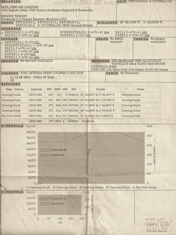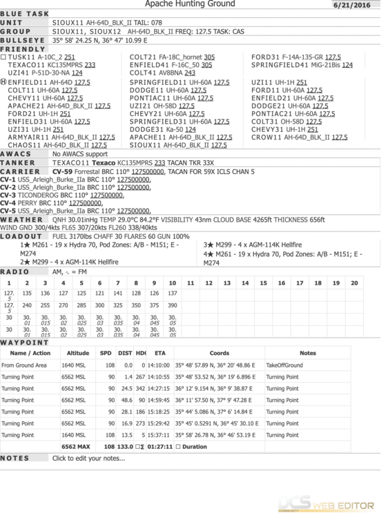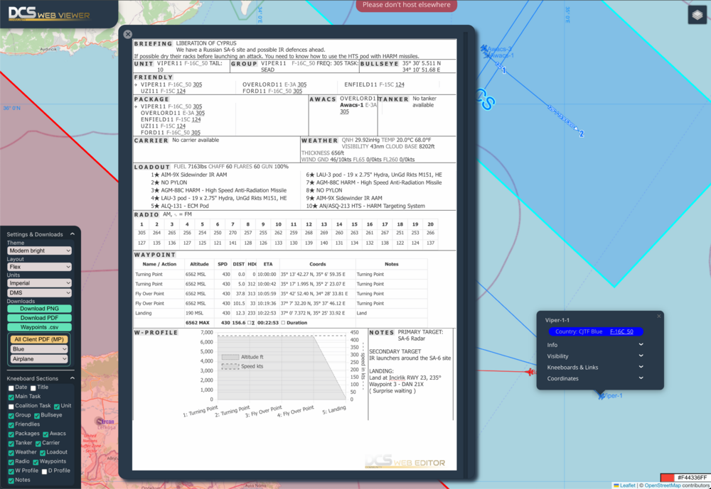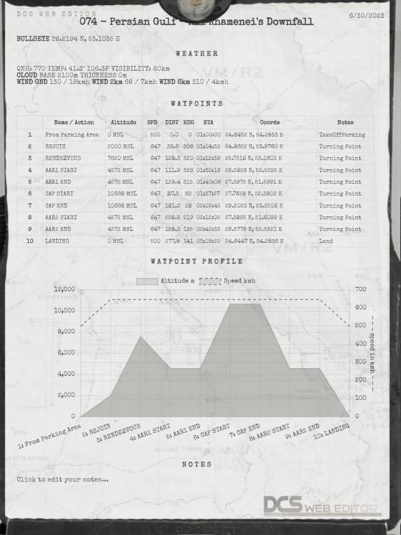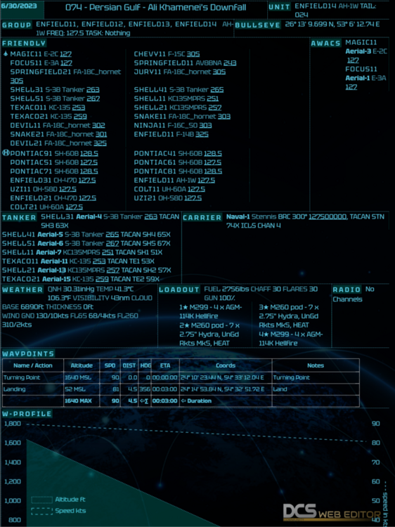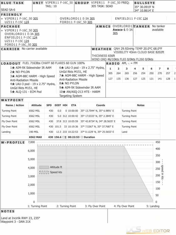 For the past couple months I've been working on a utility to help people create kneeboards/mission cards for flight nights with their squadrons/friends. I call it Digital Kneeboard Simulator. While its still a ways out from what I would consider fully feature complete it has quite a few features that I think make it compelling. No install required, is entirely a totally free webapp Miz file import with corresponding import of both flight and redfor elements. Full mission planning feature set Interactive waypoint editing Per member loadout support with exports to DCS Preset creation for mission card segments for rapid mission creation Supports all theaters (that I know of) All airbases listed and displayed on maps Easily snap waypoints to airbases Automatically calculates elevation for any point and snaps waypoints to ground if desired DCS-DTC export Loadout weight calculation with automatic rotation speed calculation Flight time and ToT calcualtions with automatic CAS calculations for interstitial waypoints Parameterized popup attack calculator Many templates with more coming Ability to publish kneeboards and share a public link to in discord for easy disemination to your squad Single click setup script included in exports Installable by hand if setup script is too scary Squadron system to allow co-operative mission creation and planning Supported airframes: F-16 (Stable) Kiowa (Stable) Apache (Stable) F-18 (Beta) A10CII (Alpha) Coming in the future Support for blufor import form a miz file Native DCS DTC file support (instead of the DCS-DTC external app, which is quite excellent) More attack profiles Note that this is not a utility to make a miz file. Instead this should be thought of as a utility to create mission cards for an existing miz file or create mission cards for squadrons that reqularly fly on servers with dynamic ranges. Screenshots: