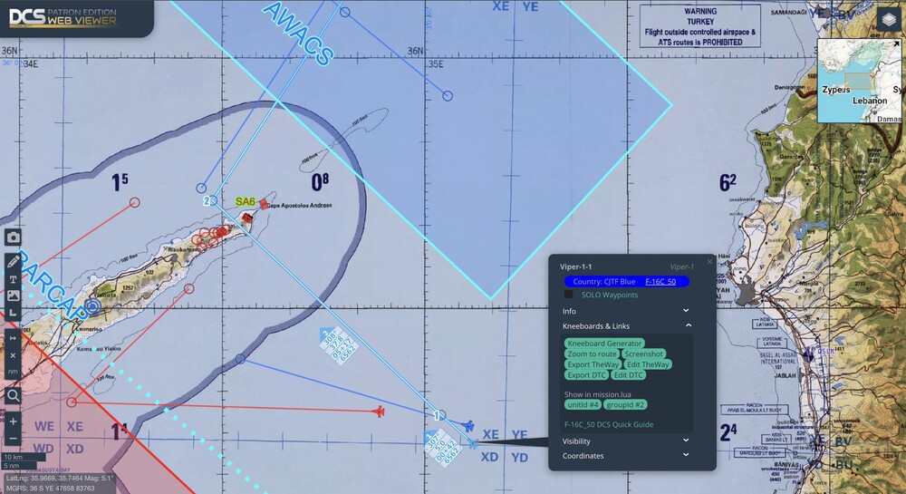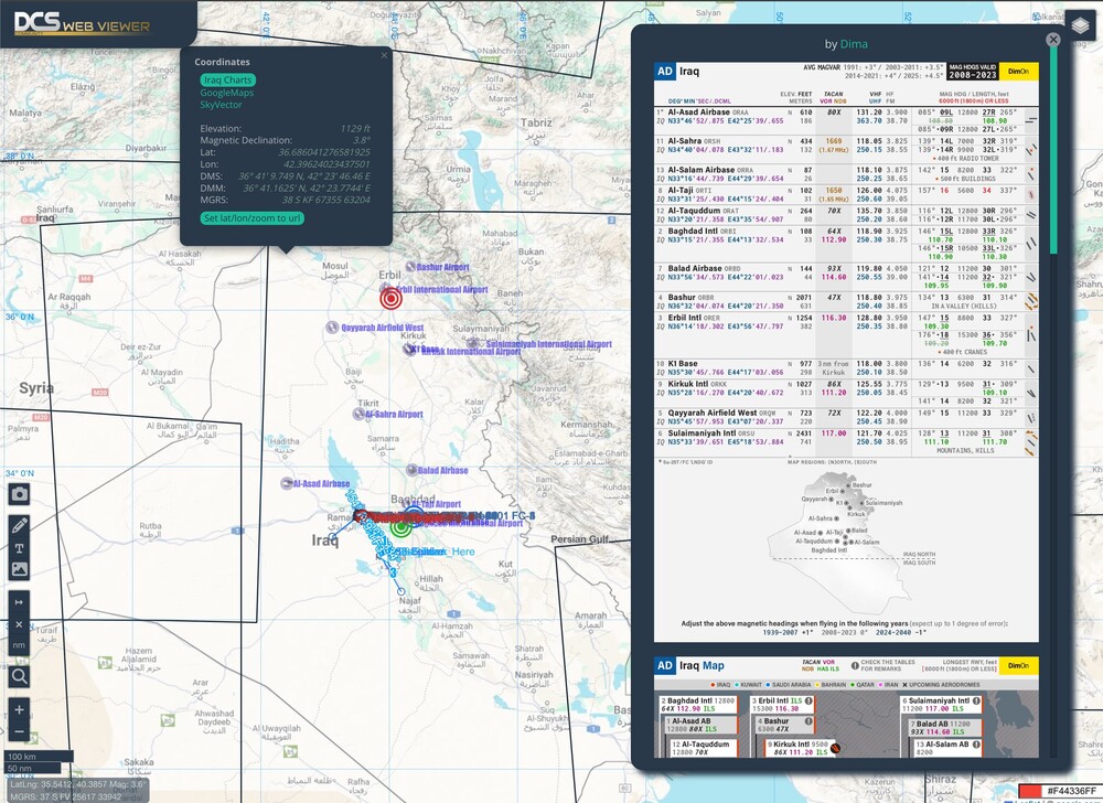 Open and plan DCS missions in your browser. Export flight paths, create nav charts, logs and more... Export kneeboard charts to PDF and PNG Export TheWay and DTC files Accurate DCS magnetic/true headings for latitude, longitude and mission time KML / KMZ support Embed in your website, i.e.https://www.v303rdfightergroup.com/index.php?pages/afghanistan_navaids/ Also checkout DCS Web Editor and DCS Web Miz DCS Web Viewer ( free edition )