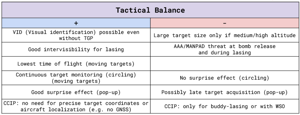 Over the past few weeks, I’ve been putting together a full series on how to employ Paveway II laser-guided bombs in DCS World. Even for the "basic" level delivery, I tried to include detailed description of your tasks in the cockpit. And hopefully, you'll discover new ways of dropping your GBUs, giving you more flexibility for various tactical scenarios across a range of real-world inspired delivery profiles. There I covered level, dive, pop-up, toss and loft bombing, with a focus on geometry, timing, arming delays, and how all of this ties into tactical decision-making. The idea is to help you make informed choices in planning and execution, especially in more demanding scenarios like high-threat airspace. Example of "tactical balance" study for one of the profiles. Guess which one... Each article comes with a set of kneeboard pages, built from ballistic tools and in-game testing. You’ll find release distances, time of flight estimates, impact angles, and recommended fuze settings, i.e. all that can actually help you hit the target and survive the pass. Example of geometry study of the dive profile. Even if examples are more centered on my module of predilection, the F/A-18C Hornet, any module carrying Paveway IIs will benefit. You can start here, the full index is in the introduction post (Patreon). From there, you can jump straight into any of the profiles. A usual, I'll appreciate any feedback or questions. And if you're into this kind of detailed weapon employment, there's more on the way!