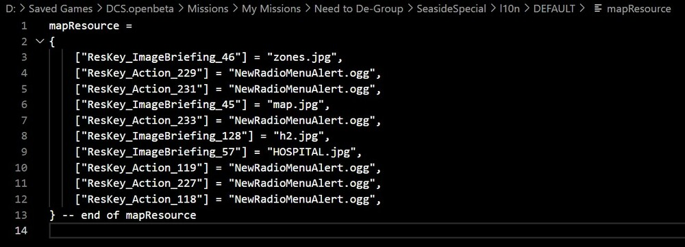 1. I don't know if it's because you moved 'mapResource' out from the root or you're not searching in that folder, but there is no apparent way to get hold of the blue/red/neutral briefing images - as you claim should be available from env.mission i.e. pictureFileNameN : table : Neutral coalition briefing images pictureFileNameB : table : Blue coalition briefing images pictureFileNameR : table : Red coalition briefing images env.mission gives the DICTIONARY KEYS but there is no way to use them to get the corresponding 'item' from the mapResource file. I don't even know why you're using a dictionary for filenames anyway as it's not like they are localised in any way. This is either a crazy but broken design idea, or it's a bug. But file names shouldn't be localised or need a 'dictionary' key. e.g. There is no way to resolve these keys...