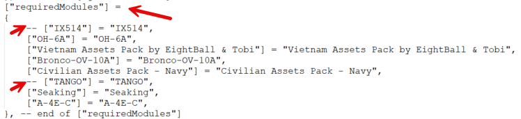1. Everyone has been there. You've downloaded a mission that sounds really cool, but you don't have all the mods required. Sometimes mods are deprecated or disappear from the internet (bonus PSA, keep mods stored away on your hard drive/cloud account so you never lose them. Update your mod manager to link the source so you can find it again, just in case). Regardless of reason, we've all experienced the dreaded ED missing mod message when trying to load a mission. But, you say, how can I get around this annoying limitation? Its very easy and I'd suggest if you're playing around with mods you should familiarize yourself with this process. Background ED's mission editor is archaic and downright frustrating. Its code originates in Lockon days and while it occasionally receives an update here or there, remains fairly predictable in how it behaves under the covers. Ever notice that a .miz file is actually a .zip file? Well it is. Whenever you save a mission the ME generates a zip file with several lua files. These files are called "mission", "options", "theatre" and "warehouses". These lua files are loaded into DCS whenever you choose to run a mission. Updates to how the ME works are simply new or changed sections in the lua files. For this VERY easy change, we focus only on the "mission" lua file (note, there are no file suffixes on these files) Steps to take 0) Copy your mission and name it something new, just in case you stumble somewhere along the way. 1) Using your favorite zip program open the .miz file of your mission. For this example, I am using my Into The Jungle mission. You will see something that looks like this below. Remember, we ONLY care about the file named "mission". Leave the zip program open. . 2) Drag the "mission" file onto your desktop so we can edit. Editing from within the zip won't work. 3) Open the "mission" file with your favorite text editor. I suggest/use Notepad++. When you open this file, you're looking at the lua code that defines the mission. Towards the top of the lua, you'll find a section labeled "requiiredModules". This is the place to make changes. DO NOT CHANGE ANYTHING ELSE. 4) In my example, I perhaps cannot locate a couple of older, some might say "Jurassic" period, mods. I will comment out the requirement by adding "-- " in front of the mod itself. See below. Save your work. Do not add any extension or suffix to the file name. Keep it "mission" 5) Next drag your edited "mission" file back into the zip program and overwrite the existing mission file and then close the zip. 6) Open the mission in DCS ME. It now loads because you removed the requiredmodule binding in the "mission" lua in step4. 7) Save the mission from the DCS ME. It will remove those modules that were commented out. QED Hope this helps someone down the road. @bignewy or @nineline, can you move this to the main ME forum. I fat fingered this into scripting tips and tricks by mistake. Thanks.
