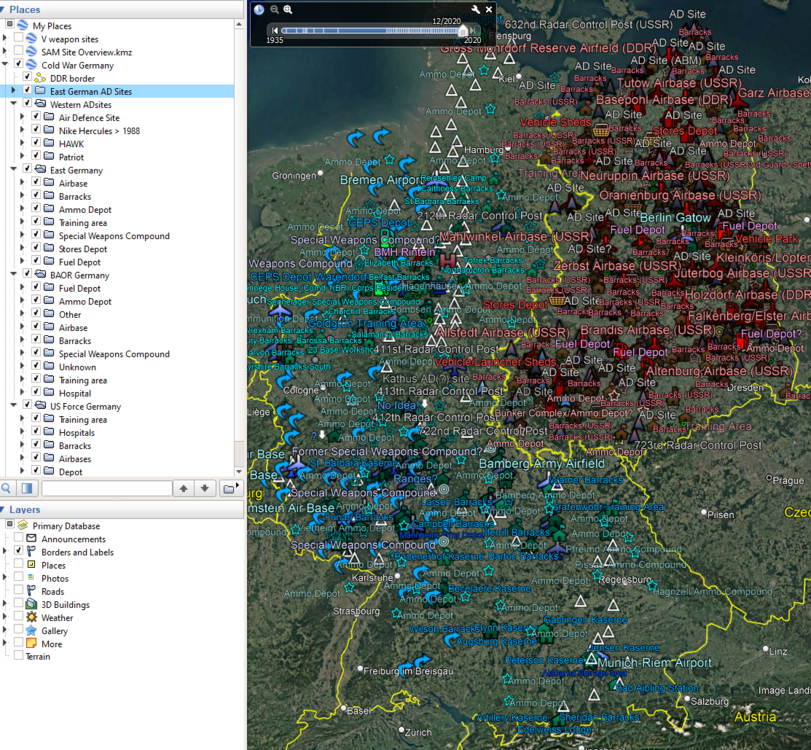 [18th April update: Thanks to the thread contributors and all those documents, this is such a fascinating and amazing topic. This project was massively ambitious and in a competition for my time between everything else and a 5th month old Border Collie puppy with no manners, I submit my work to date to the community 'as is' to do what you like with! Attached kmz. ] I could use some help from the armchair army to check the Google KML I am producing, before public release. Using a combination of KML's from Speedy on the army rumour service for the British and Soviet installations, a filtered SAMsite overview and my own work to collect, locate and organize the US installations I have over 1210 Google mapmarkers in the most complete rendition of 1960-1995 Germany's Cold War installations. The KML will eventually become a key reference resource for locations in the upcoming DCS map. Mission makers can check the details provided for targets and mission use. The KML will eventually be imported to DCS as a rough template of locations. I don't intend to place any objects as there won't be a 1:1 parity and there are clearly too many, but it is enough to add sites for your missions. The KML for Cold War Germany comprises of: Over 1200 placemarks categorised and colour coded (so far) The inner border reference line East and West Air defence sites (for West, the Nike Hercules is available for pre 1984 but dates are pretty tough to get) British American Soviet/E. German --Airbases and minor Helicopter airfields --Barracks and installations --Ammo Depots --Training Areas --Special Weapons Compounds --Stores --Fuel dumps/CEPS The rough time range for these is 1960-1995. What I am looking for initially is anyone interested in helping expand on this, specially if they want to zero in on, for example, enriching the US Kazernes with any reference links, tidying up the current placemarks, finding names for the unamed ammo dumps, checking the data with online references, etc. I'm definitely interested in anyone with knowledge of the Eastern European theatre, the locations and names of units and their stations, the airbase complements and time ranges. Also those with good knowledge of the FEBA and plans who can identify major themes that can be added to the KML or fill holes and gaps, such as the areas east of Luneburg and Hamburg, east of Braunschweig, east of Salzgitter and Northeim, etc. Please don't ask for the WIP copy, it will arrive here when its done. Feel free to add details of the theatre to this thread. Whilst I've seen a lot of resources online, its not the finding of the information so much as the time it takes to create a nice placemark with links, find the modern day geo coordinates from the resource that is now hidden under a Lidl or BMW factory and so on. there's issues of time and date filters which I havent even attempted. It will never be perfect but thats not the aim. Cold War Germany.kmz