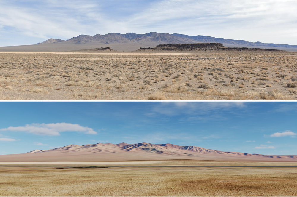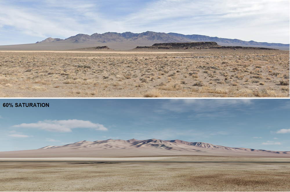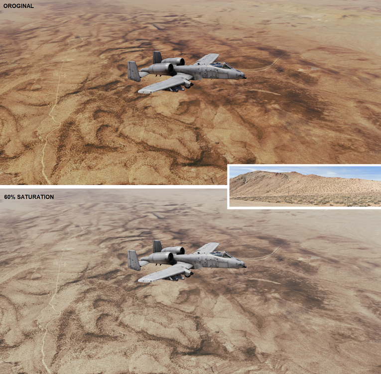 The map textures are out of anything I see from quality photos (taken from ground/form air). Compare the picture yourselves: Its not a big deal, not a bug, but because of that I feel like something not correct every time I fly a mission on this map. I my say, that I love this map, some more detailed elevation resolution would be very nice, but as long as you not flying low, it doesn't really matter. It seems to me, that someone who took care of NTTR textures has color shifted display tuned for COLD setting. Picture form DCS and Google picture from exact same spot (similar day time): Edited DCS screenshot compare: This is another compare of 60% screenshot with the original one, and small terrain photo in middle.