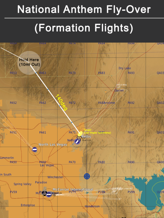 A flyover has been requested by Las Vegas Speedway this weekend and your unit has been tasked with performing the show. Use the ToS/ToT feature and on your jet, communication and timing skills to perform a precise flyover for the National Anthem. This is a great way to train for Time on Target missions, or for those who love airshow flying. - Perform a precise flyover for the National Anthem at Las Vegas Speedway. - Fly either an F-18c or F-16c_50 - Approx. time: 25min (you'll spend about 10-15min holding and turning circles if you get up in the air too fast. This is designed to help people get into formation/position) - Practice holding in a position to wait for the ToT/ToS call. Try to maintain 45-60sec turns. - Fly either A 4-ship formation where your Lead is the only one concerned with ToT/ToS Or fly to separate waypoints and meet up over the center of the stadium at the exact time. - Communicate with your wingmen to deconflict altitude. The stadium already as fireworks and doesn't need more. - Don't rely on the carrot symbol on your HUD, but follow your directed Ground Speed to be more accurate. NOTE: This mission was made using Hasard Lee's youtube video "How Flyovers Work" as reference. I am not an actual pilot. Any comments/suggestions welcome. Thanks!