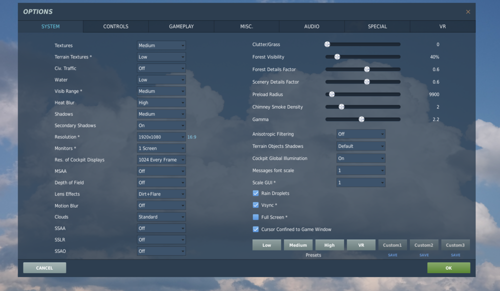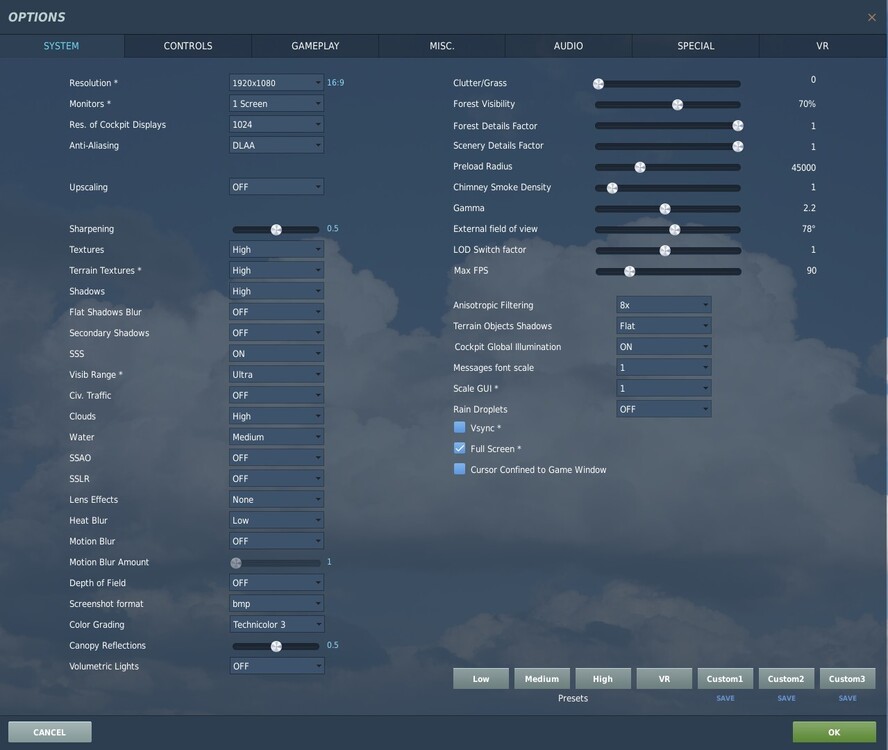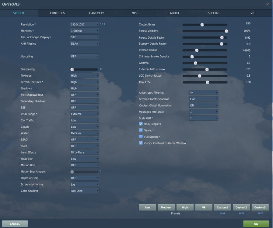 Hello all, I'm experiencing very low fps that's specific to the F4, as in, in a situation where I'm stable at around 80fps in the tomcat, the phantom does around 17fps, and drops even further down. In other situations it is slightly better, sometimes even reaching 60fps, however even in those situations the moment I start to look around fps drops to below 20fps. this seem to be worse on caucuses and worse when lower to the ground. This is happening also with the radar off or even when sitting in a cold dark cockpit. Again, same situation with the tomcat and I do just fine. I have tried lowering my settings some, including my resolution, and haven't had much of an improvement. I'm running a single monitor at 1920x1080. my rig is a ryzen3600xt\rtx2070super with 32gb ram. Dcs is installed in the C drive which is a 500gb m.2 with 75GB of free space. I'm on an up to date windows 10 22H2 with the latest nvidia game drivers. I will try to upload pictures of my graphics settings shortly. I have tried several missions in both Persian gulf and in caucuses, Persian gulf was slightly better. I'm also using opentrack alongside the game, but have made an effort to ensure nothing else is running that would be an issue. I also tried to delete my fxo and metashaders folders and that seemed to be no help. I have just completed running a full repair of dcs and will be trying again, I'll grab screenshots of my settings while I'm at it. This is obviously very frustrating as it makes the aircraft unplayable for me, but I understand that there can be issues in an early access release and I'm eager to provide as much data as I can to help solve this issue, I've seen some others complain of this on reddit aswell. Please advise on further steps to track down the issue. Thanks! Edit: attached a picture of my settings, note in the picture the fullscreen option is unchecked, this is only to allow me to take the picture, actual flying is done in full screen. Also note while lowering settings does help somewhat, checking six still means getting a major stuttering fit which if likened to a coughing fit would alarm even the heaviest of smokers. null