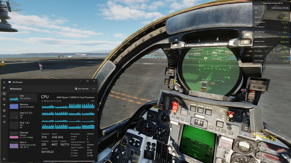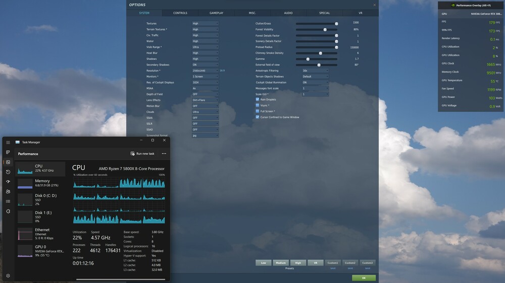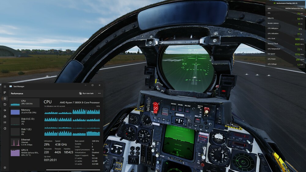 First of all, I want to apologize for the fact that I don't speak English and I can't know if there is already a topic of this kind or not. Everything goes well at the beginning, when performing the startup, taxiing, and taking off and climbing up to 30,000 feet, but when doing missile evasion maneuvers, and I go down to 10,000 feet the FPS is around 50-55 and my normal FPS is 120 FPS. The strangest thing is that when you open the task manager, this is all solved, any solution? This problem has been going on since version 2.8. Most played server: ShadowReapers PvE Caucasus Plane: F-16 Settings: System: Asus tuf z690 plus d4 i5 12600k 32gb ram g.skill tridentz rgb (4x8) asus tuf rtx 3060 ti gddr6x Peripherals: VKB Gladiator NXT EVO Standart Thrustmaster TWCS TrackIR 5 DCS-BIOS (arduino nano, 3 buttons, 4 switch, 6 LEDs)